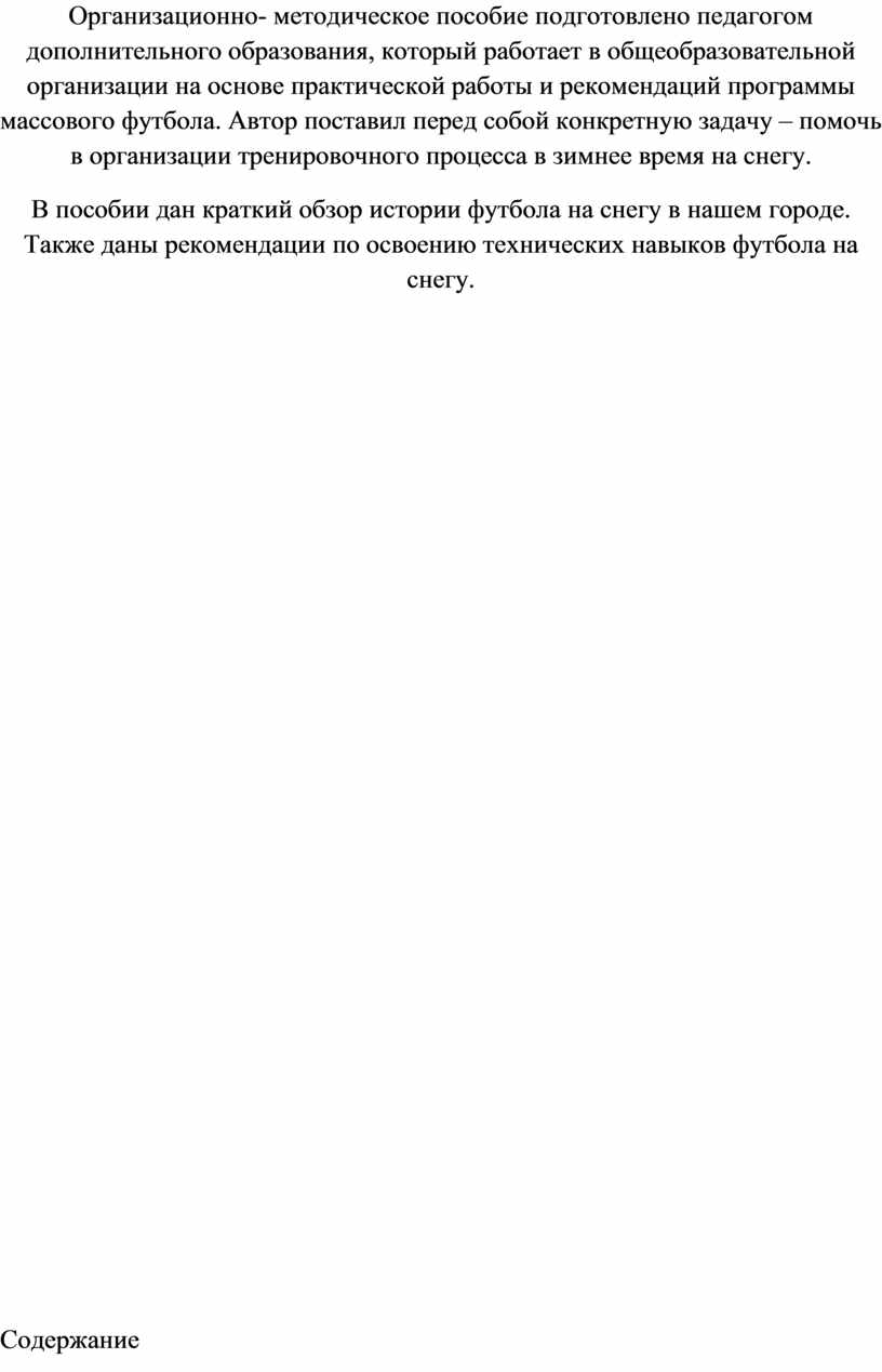 Организационно- методическое пособие подготовлено педагогом дополнительного образования, который работает в общеобразовательной организации на основе практической работы и рекомендаций программы массового футбола. Автор поставил перед собой конкретную задачу – помочь в организации тренировочного процесса в зимнее время на снегу.