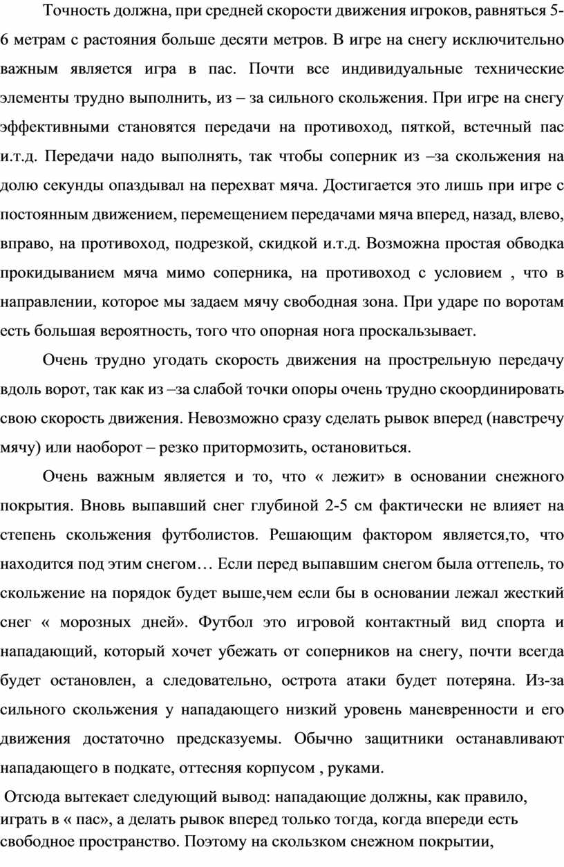 Очень важным является и то, что « лежит» в основании снежного покрытия. Вновь выпавший снег глубиной 2-5 см фактически не влияет на степень скольжения футболистов. Решающим фактором является,то, что находится под этим снегом… Если перед выпавшим снегом была оттепель, то скольжение на порядок будет выше,чем если бы в основании лежал жесткий снег « морозных дней». Футбол это игровой контактный вид спорта и нападающий, который хочет убежать от соперников на снегу, почти всегда будет остановлен, а следовательно, острота атаки будет потеряна. Из-за сильного скольжения у нападающего низкий уровень маневренности и его движения достаточно предсказуемы. Обычно защитники останавливают нападающего в подкате, оттесняя корпусом , руками.