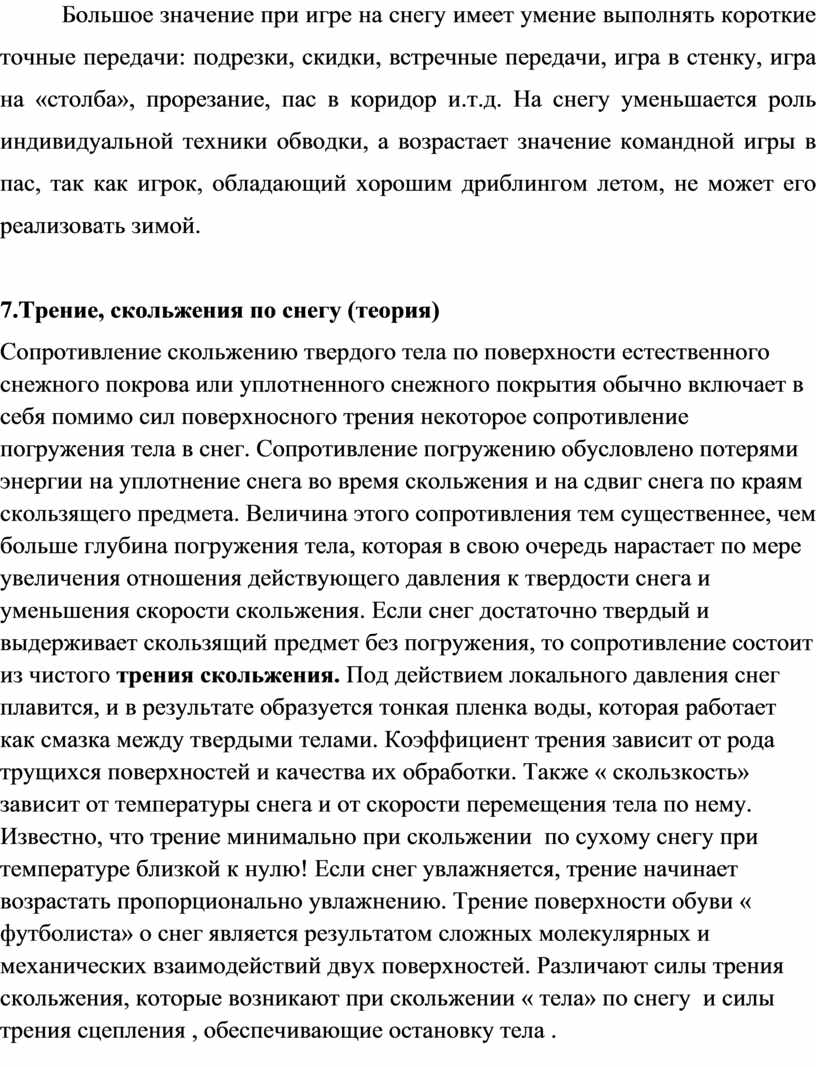 Сопротивление скольжению твердого тела по поверхности естественного снежного покрова или уплотненного снежного покрытия обычно включает в себя помимо сил поверхносного трения некоторое сопротивление погружения тела в снег. Сопротивление погружению обусловлено потерями энергии на уплотнение снега во время скольжения и на сдвиг снега по краям скользящего предмета. Величина этого сопротивления тем существеннее, чем больше глубина погружения тела, которая в свою очередь нарастает по мере увеличения отношения действующего давления к твердости снега и уменьшения скорости скольжения. Если снег достаточно твердый и выдерживает скользящий предмет без погружения, то сопротивление состоит из чистого трения скольжения. Под действием локального давления снег плавится, и в результате образуется тонкая пленка воды, которая работает как смазка между твердыми телами. Коэффициент трения зависит от рода трущихся поверхностей и качества их обработки. Также « скользкость» зависит от температуры снега и от скорости перемещения тела по нему. Известно, что трение минимально при скольжении по сухому снегу при температуре близкой к нулю! Если снег увлажняется, трение начинает возрастать пропорционально увлажнению. Трение поверхности обуви « футболиста» о снег является результатом сложных молекулярных и механических взаимодействий двух поверхностей. Различают силы трения скольжения, которые возникают при скольжении « тела» по снегу и силы трения сцепления , обеспечивающие остановку тела . Различие в силе трения скольжения обуславливаются образованием водяной пленки разной толщины.