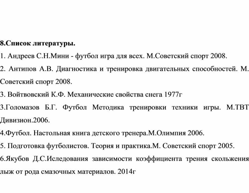 2. Антипов А.В. Диагностика и тренировка двигательных способностей. М. Советский спорт 2008.
