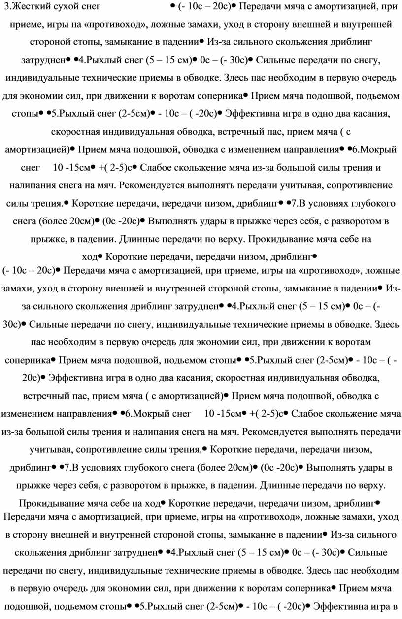 Твердое покрытие (0 до 5 см) При таком покрытии поля, большим значением, является вид обуви. В « сороконожках» шипы хоть немного, но врезаются в жесткое покрытие, чем при игре в гладкой обуви. При таком поле в игре значительно возрастает скорость паса. Неглубокий снежный покров дает возможность проводить обводку на высоких скоростях. При остановке мяча, необходимо обратить внимание на прием мяча с аммортизацией (проводкой мяча). Чем замечателен этот технический элемент, именно на снегу ?