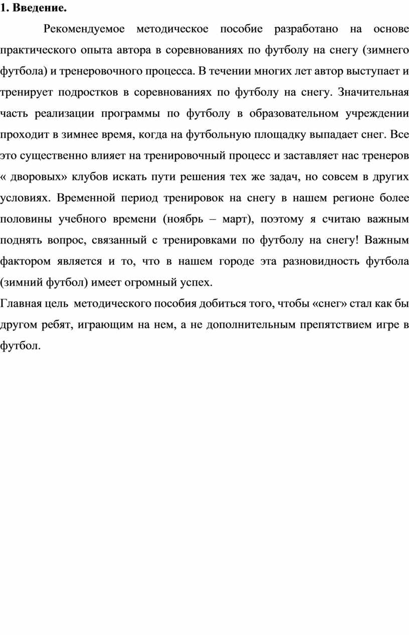 Рекомендуемое методическое пособие разработано на основе практического опыта автора в соревнованиях по футболу на снегу (зимнего футбола) и тренеровочного процесса. В течении многих лет автор выступает и тренирует подростков в соревнованиях по футболу на снегу. Значительная часть реализации программы по футболу в образовательном учреждении проходит в зимнее время, когда на футбольную площадку выпадает снег. Все это существенно влияет на тренировочный процесс и заставляет нас тренеров « дворовых» клубов искать пути решения тех же задач, но совсем в других условиях. Временной период тренировок на снегу в нашем регионе более половины учебного времени (ноябрь – март), поэтому я считаю важным поднять вопрос, связанный с тренировками по футболу на снегу! Важным фактором является и то, что в нашем городе эта разновидность футбола (зимний футбол) имеет огромный успех.