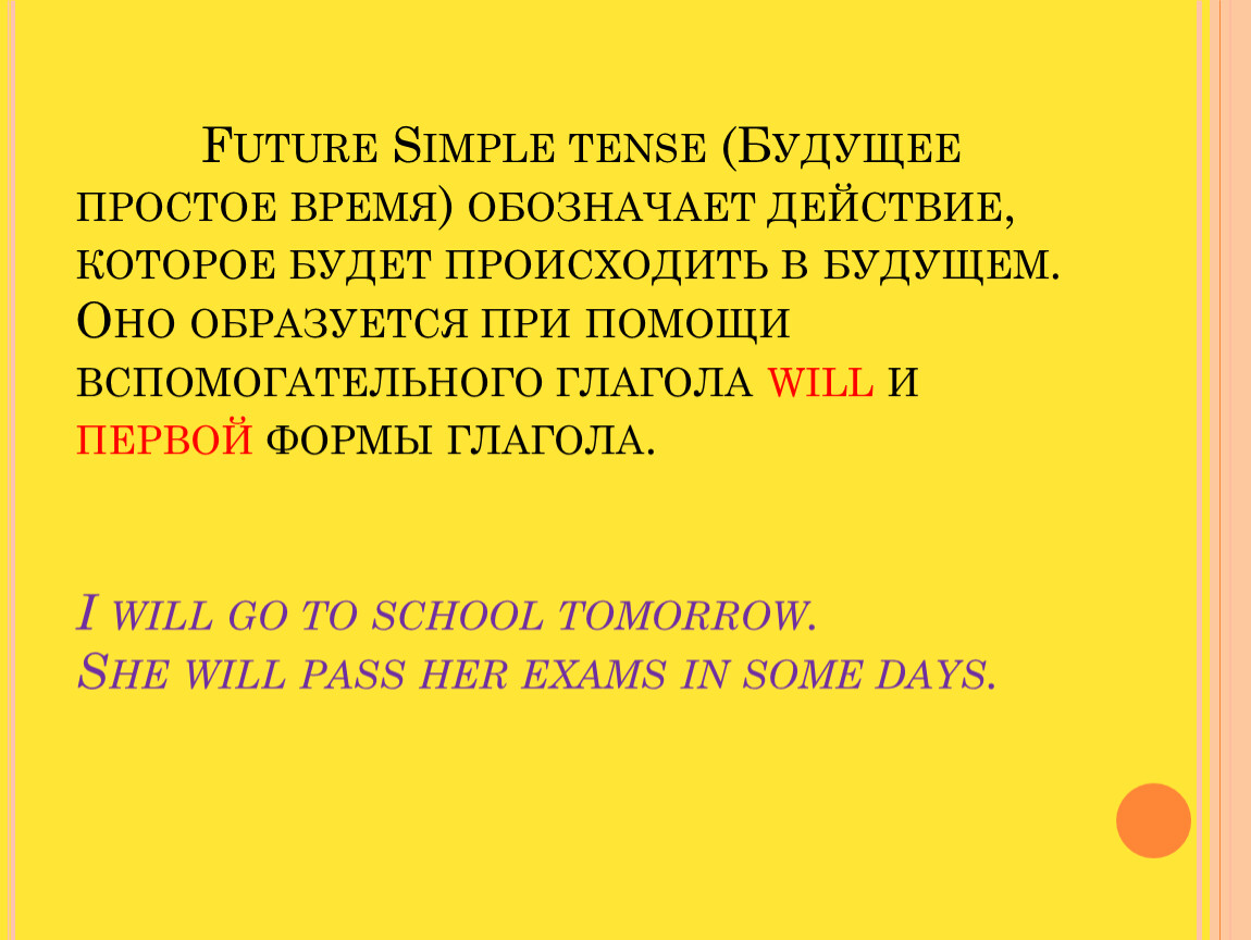Future Simple tense (Будущее простое время) обозначает действие, которое будет происходить в будущем. Оно образуется при помощи вспомогательного глагола will и первой формы глагола. I will go to school tomorrow. She will pass her exams in some days.