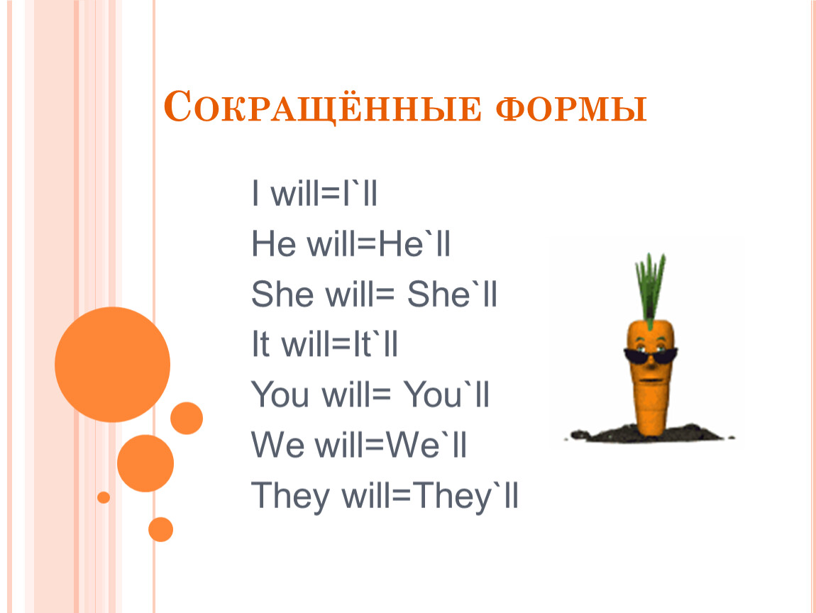 Отрицательные предложения образуются при помощи частицы not Will not =won`t I will not go to school tomorrow. She will not pass her exams in some days