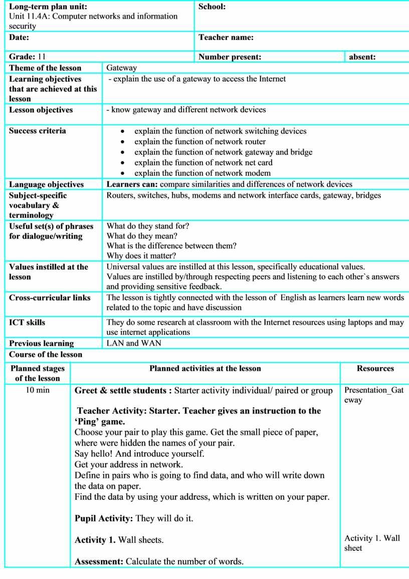 Greet & settle students : Starter activity individual/ paired or group Teacher Activity: Starter. Teacher gives an instruction to the ‘Ping’ game. Choose your pair to play this game. Get the small piece of paper, where were hidden the names of your pair. Say hello! And introduce yourself. Get your address in network. Define in pairs who is going to find data, and who will write down the data on paper. Find the data by using your address, which is written on your paper.