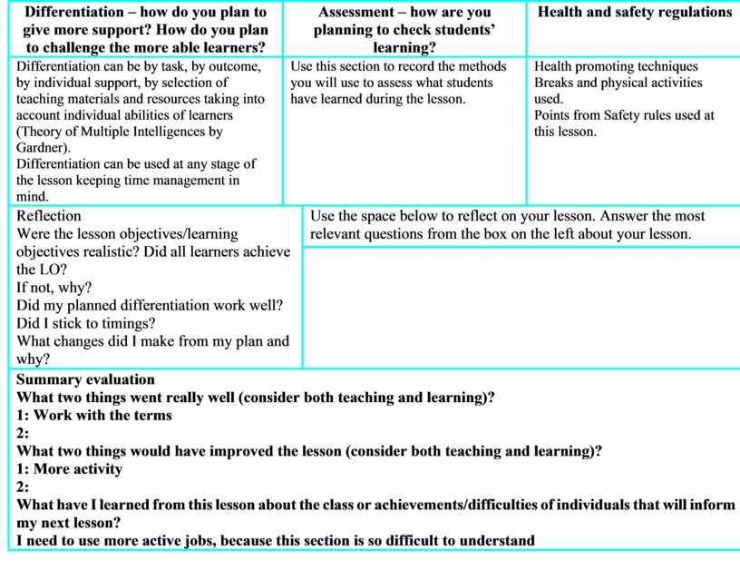 Summary evaluation What two things went really well (consider both teaching and learning)? 1: Work with the terms 2: What two things would have improved the lesson (consider both teaching and learning)? 1: More activity 2: What have I learned from this lesson about the class or achievements/difficulties of individuals that will inform my next lesson? I need to use more active jobs, because this section is so difficult to understand |