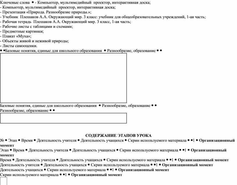 - Компьютер, мультимедийный проектор, интерактивная доска; - Презентация «Природа. Разнообразие природы.»; - Учебник Плешаков А.А. Окружающий мир. 3 класс: учебник для общеобразовательных учреждений, 1-ая часть; - Рабочая тетрадь Плешаков А.А. Окружающий мир. 3 класс, 1-ая часть; - Рабочие листы с таблицами и схемами; - Предметные картинки; - Плакат «Муха»; - Объекты живой и неживой природы; - Листы самооценки.