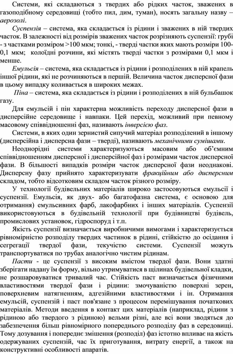 Суспензія – система, яка складається із рідини і зважених в ній твердих часток. В залежності від розмірів зважених часток розрізняють суспензії: грубі - з частками розміром >100 мкм; тонкі, - тверді частки яких мають розміри 100-0,1 мкм; колоїдні розчини, які містять тверді частки з розмірами 0,1 мкм і менше.
