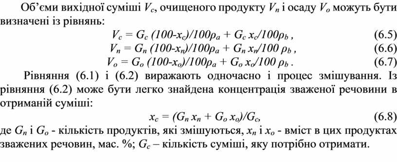 Об’єми вихідної суміші Vс, очищеного продукту Vп і осаду Vo можуть бути визначені із рівнянь: