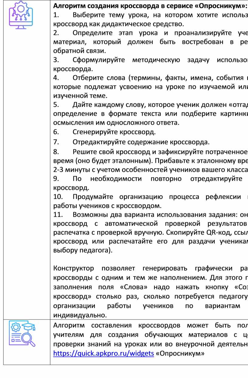 Алгоритм составления кроссвордов может быть полезен учителям для создания обучающих материалов с целью проверки знаний на уроках или во внеурочной деятельности. https://quick.apkpro.ru/widgets «Опросникум» |