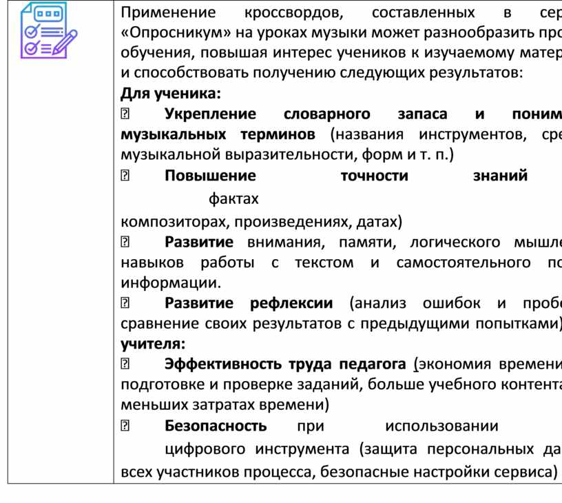 Применение кроссвордов, составленных в сервисе «Опросникум» на уроках музыки может разнообразить процесс обучения, повышая интерес учеников к изучаемому материалу и способствовать получению следующих результатов: Для ученика: § Укрепление словарного запаса и понимание музыкальных терминов (названия инструментов, средств музыкальной выразительности, форм и т. п.) § Повышение точности знаний (о фактах композиторах, произведениях, датах) § Развитие внимания, памяти, логического мышления, навыков работы с текстом и самостоятельного поиска информации. § Развитие рефлексии (анализ ошибок и пробелов, сравнение своих результатов с предыдущими попытками) Для учителя: § Эффективность труда педагога (экономия времени при подготовке и проверке заданий, больше учебного контента при меньших затратах времени) § Безопасность при использовании цифрового инструмента (защита персональных данных всех участников процесса, безопасные настройки сервиса) |