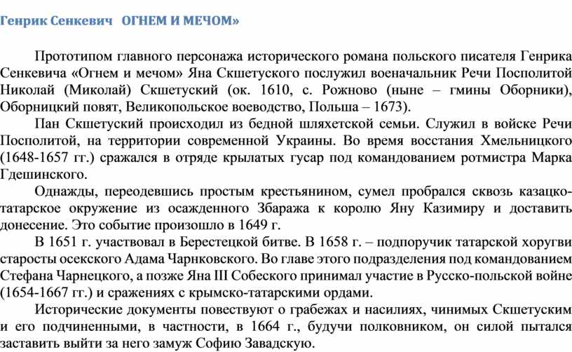 Исторические документы повествуют о грабежах и насилиях, чинимых Скшетуским и его подчиненными, в частности, в 1664 г., будучи полковником, он силой пытался заставить выйти за него замуж Софию Завадскую.