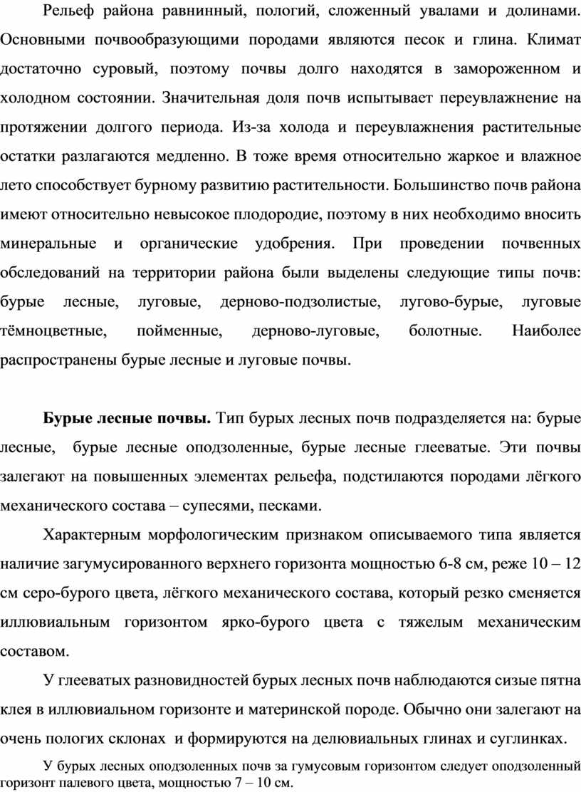 Глубина и характер промерзания почвы, как известно, зависит от температуры воздуха, влажности почвы, ее химических и физических свойств, мощности снежного покрова. В связи с суровостью зимы и незначительным снежным покровом промерзание почвы достигает значительных размеров – 2,5-3 м. Случается, что в иные годы промерзший слой не успевает оттаять за один теплый сезон. Оттаивание почвы происходит медленно. Это сказывается на вегетации растений. Отрастание трав начинается при температуре почвы +50 С, которая приходится на конец апреля - начало мая. В районе нельзя выращивать озимые культуры из-за сильного промерзания грунта. [31, С.40-41]