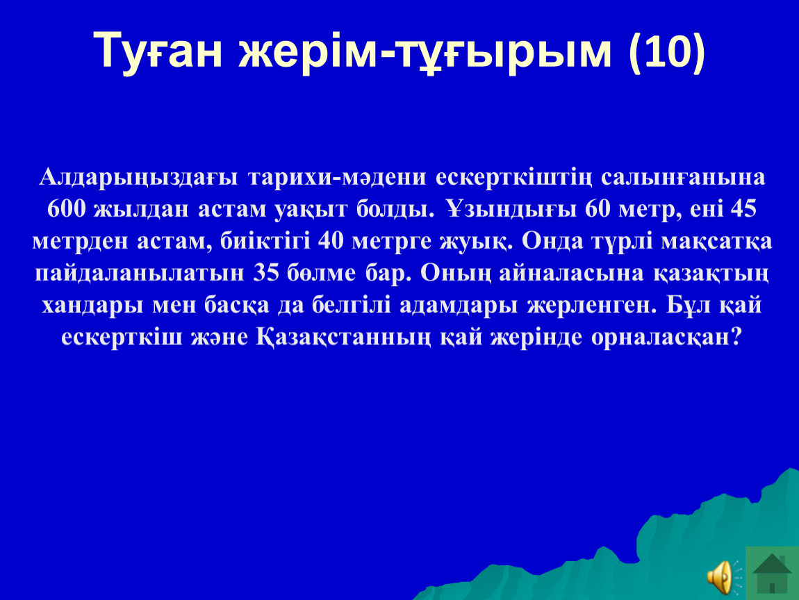 Алдарыңыздағы тарихи-мәдени ескерткіштің салынғанына 600 жылдан астам уақыт болды. Ұзындығы 60 метр, ені 45 метрден астам, биіктігі 40 метрге жуық. Онда түрлі мақсатқа пайдаланылатын 35 бөлме бар. Оның айналасына қазақтың хандары мен басқа да белгілі адамдары жерленген. Бұл қай ескерткіш және Қазақстанның қай жерінде орналасқан?