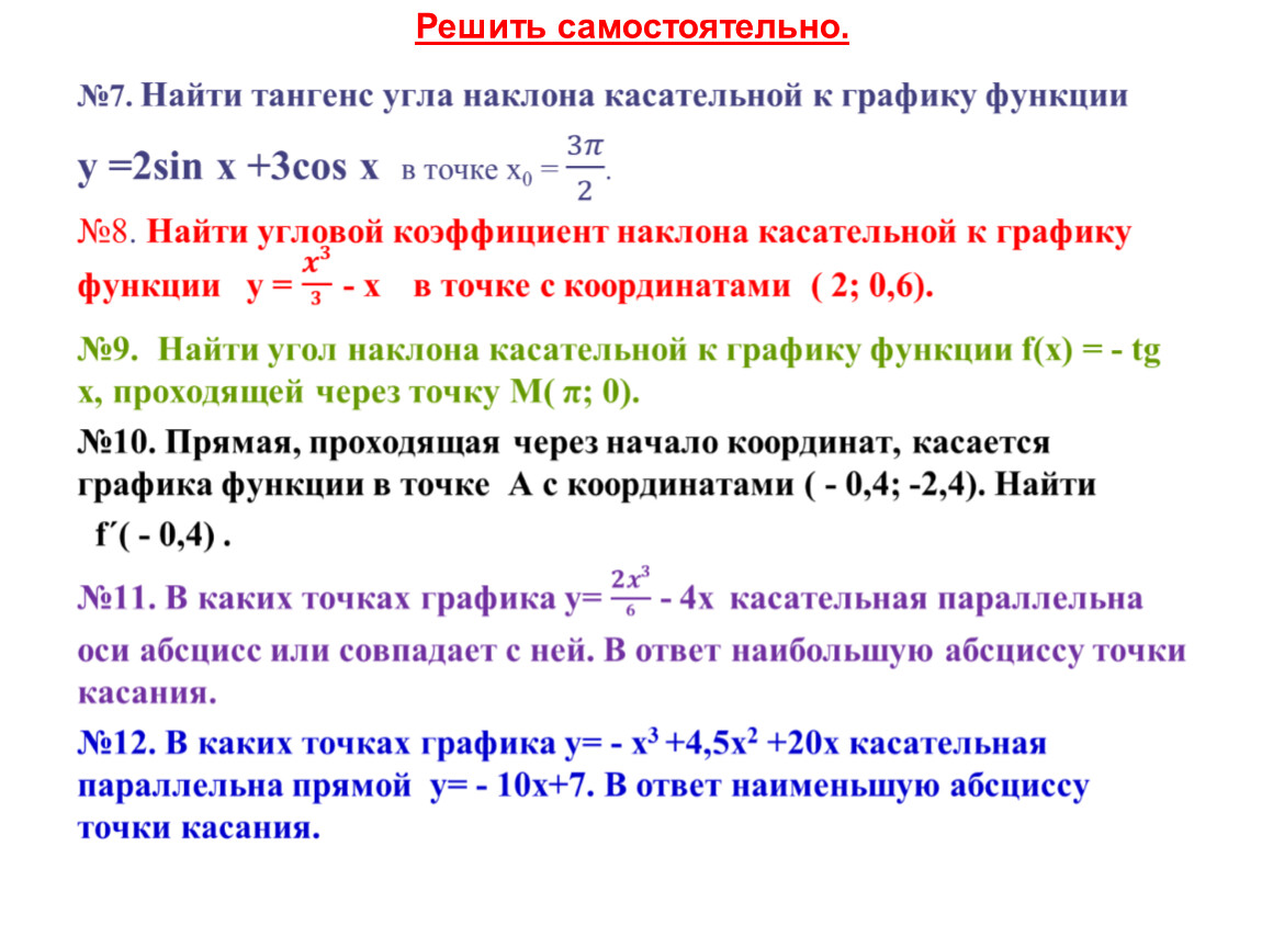 Задачи на вычисление тангенса угла наклона касательной, углового коэффициента, угла наклона касательной.