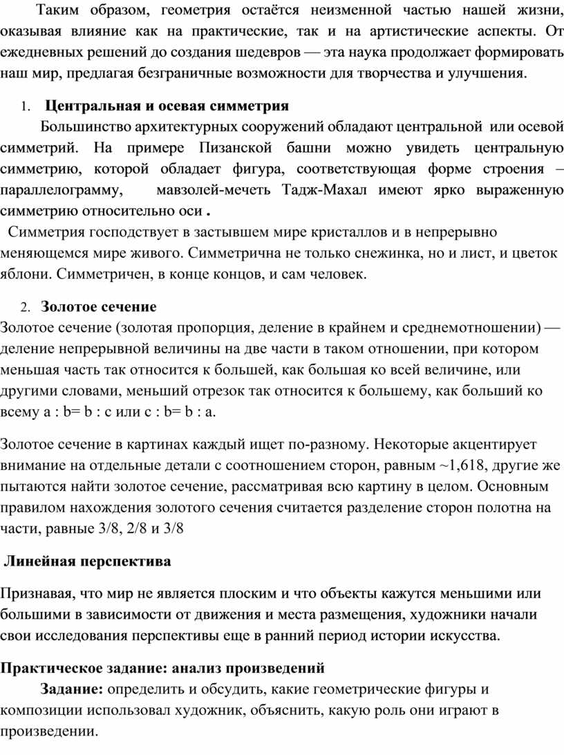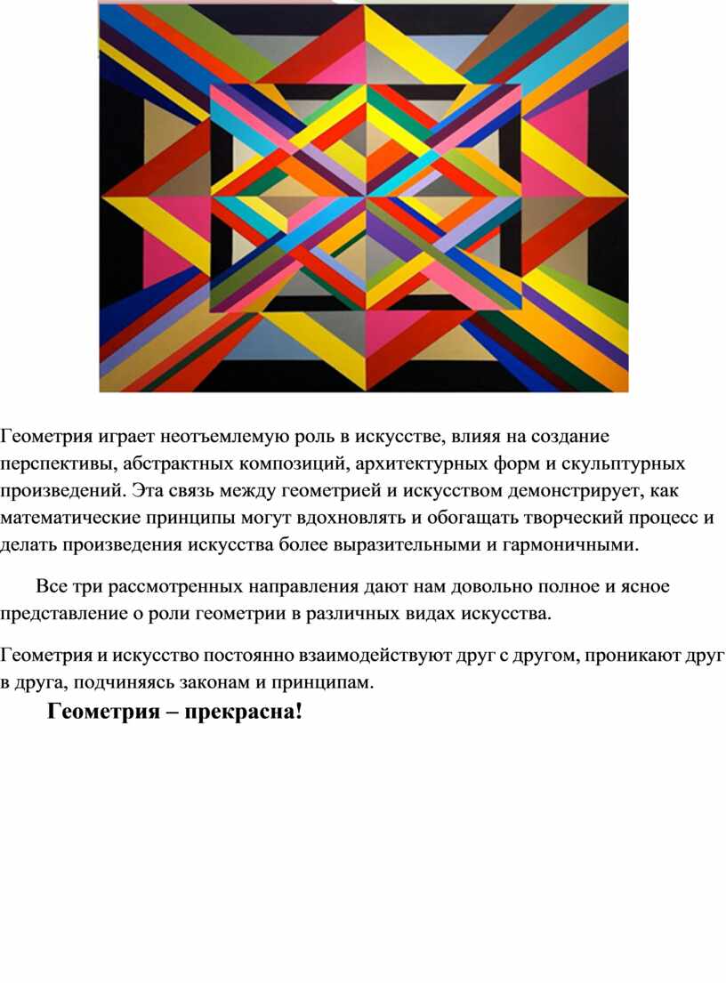 Все три рассмотренных направления дают нам довольно полное и ясное представление о роли геометрии в различных видах искусства.