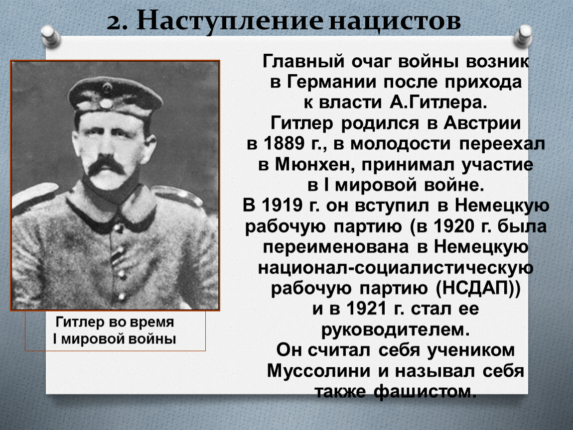 Главный очаг войны возник в Германии после прихода к власти А.Гитлера. Гитлер родился в Австрии в 1889 г., в молодости переехал в Мюнхен, принимал участие в I мировой войне. В 1919 г. он вступил в Немецкую рабочую партию (в 1920 г. была переименована в Немецкую национал-социалистическую рабочую партию (НСДАП)) и в 1921 г. стал ее руководителем. Он считал себя учеником Муссолини и называл себя также фашистом.