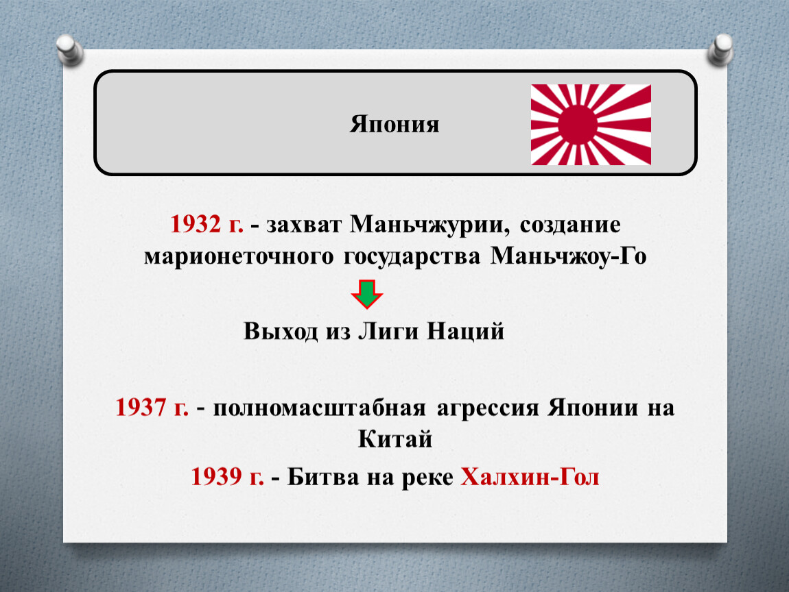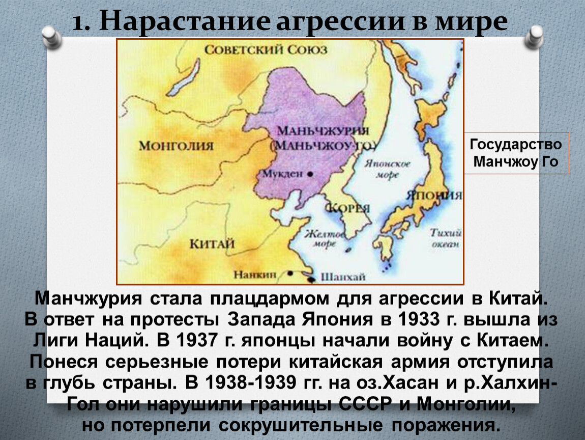 Манчжурия стала плацдармом для агрессии в Китай. В ответ на протесты Запада Япония в 1933 г. вышла из Лиги Наций. В 1937 г. японцы начали войну с Китаем. Понеся серьезные потери китайская армия отступила в глубь страны. В 1938-1939 гг. на оз.Хасан и р.Халхин-Гол они нарушили границы СССР и Монголии, но потерпели сокрушительные поражения.