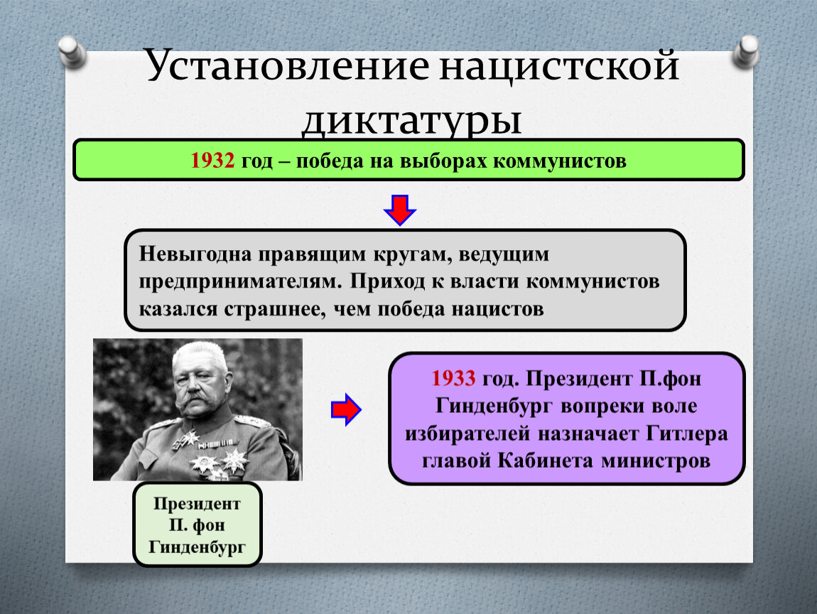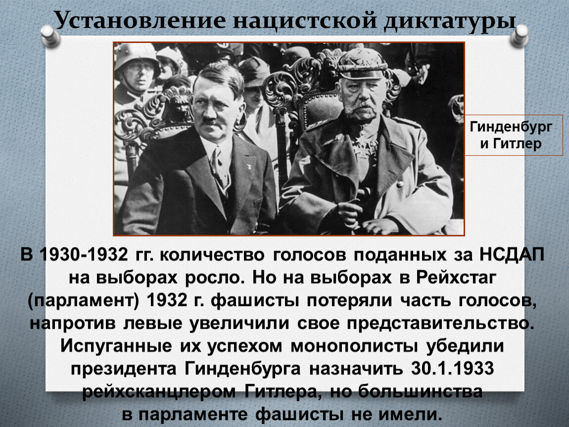В 1930-1932 гг. количество голосов поданных за НСДАП на выборах росло. Но на выборах в Рейхстаг (парламент) 1932 г. фашисты потеряли часть голосов, напротив левые увеличили свое представительство. Испуганные их успехом монополисты убедили президента Гинденбурга назначить 30.1.1933 рейхсканцлером Гитлера, но большинства в парламенте фашисты не имели.