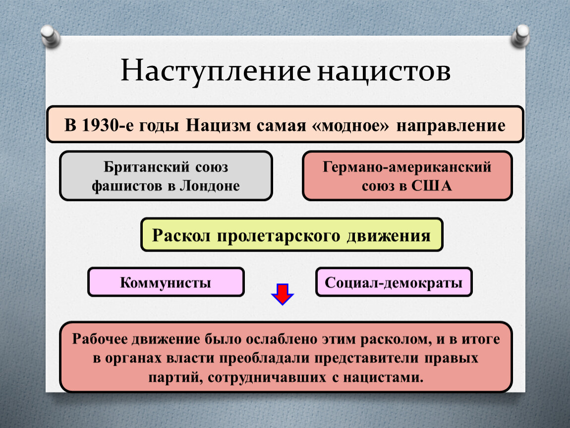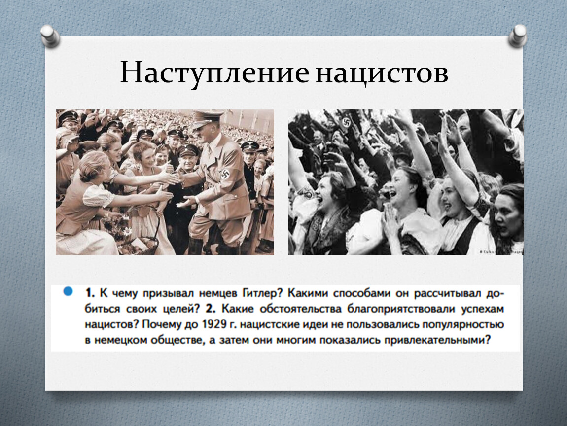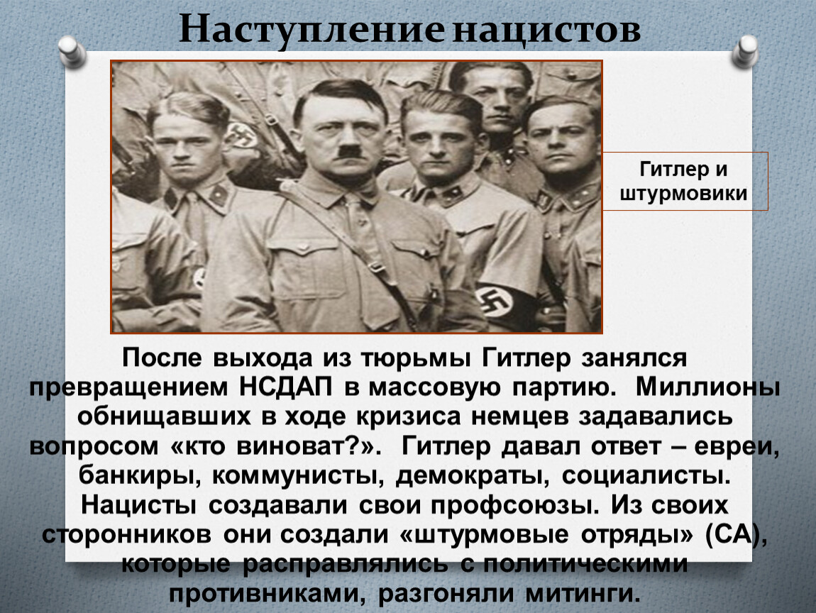 После выхода из тюрьмы Гитлер занялся превращением НСДАП в массовую партию. Миллионы обнищавших в ходе кризиса немцев задавались вопросом «кто виноват?». Гитлер давал ответ – евреи, банкиры, коммунисты, демократы, социалисты. Нацисты создавали свои профсоюзы. Из своих сторонников они создали «штурмовые отряды» (СА), которые расправлялись с политическими противниками, разгоняли митинги.