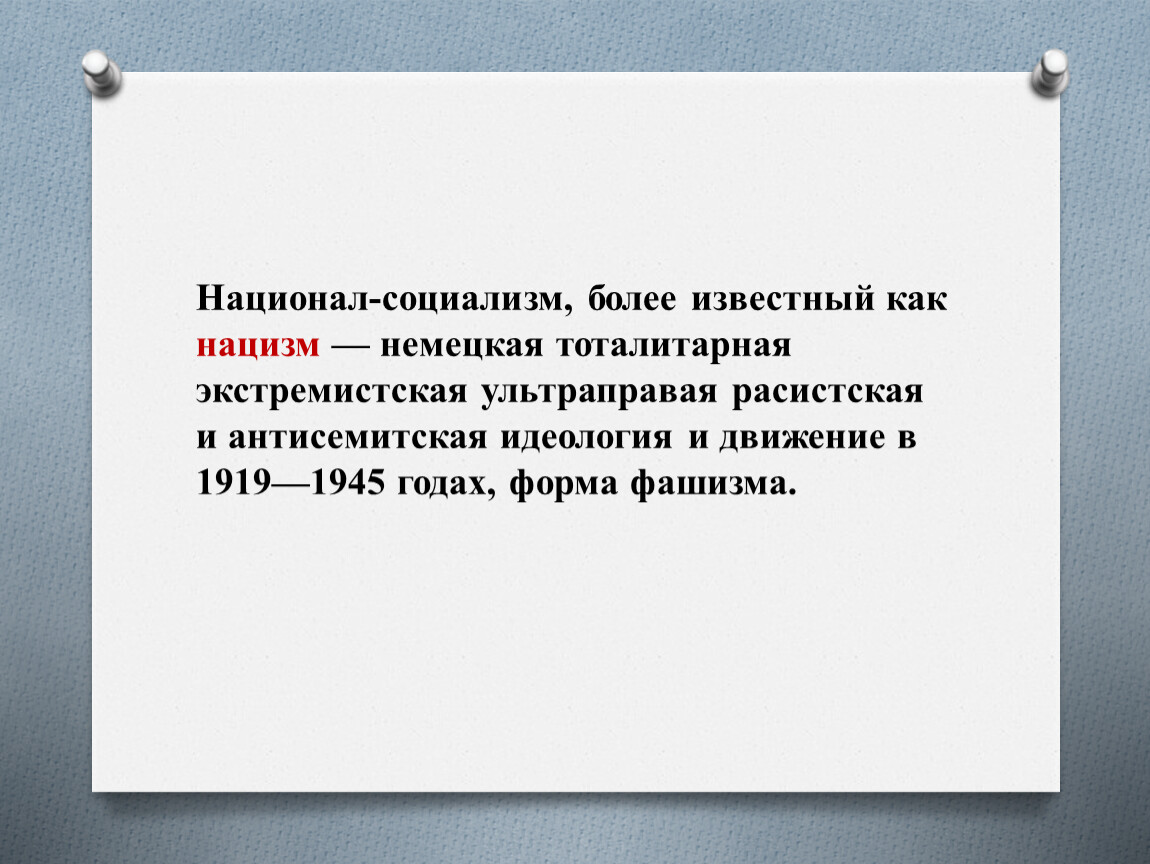 Национал-социализм, более известный как нацизм — немецкая тоталитарная экстремистская ультраправая расистская и антисемитская идеология и движение в 1919—1945 годах, форма фашизма.
