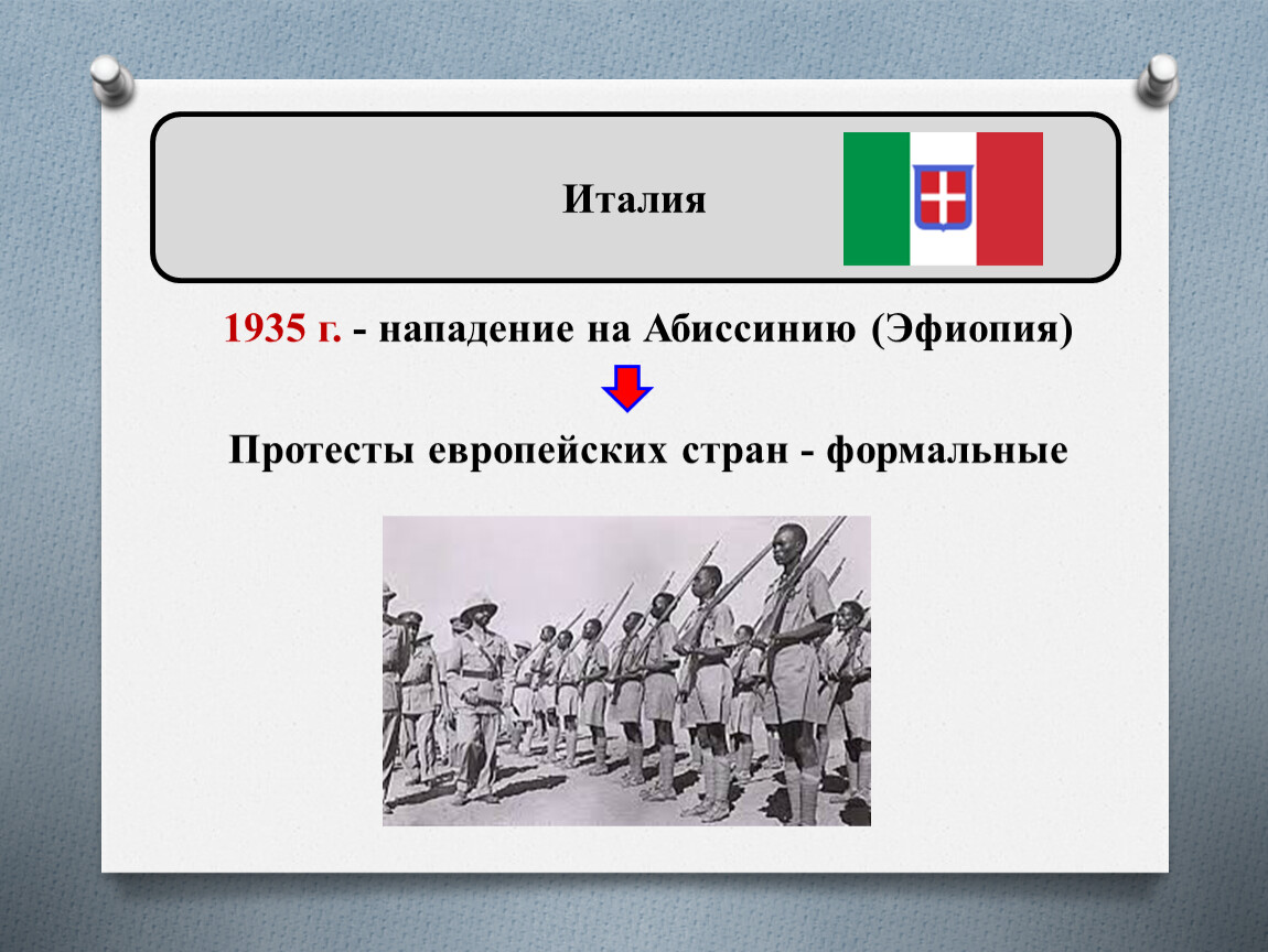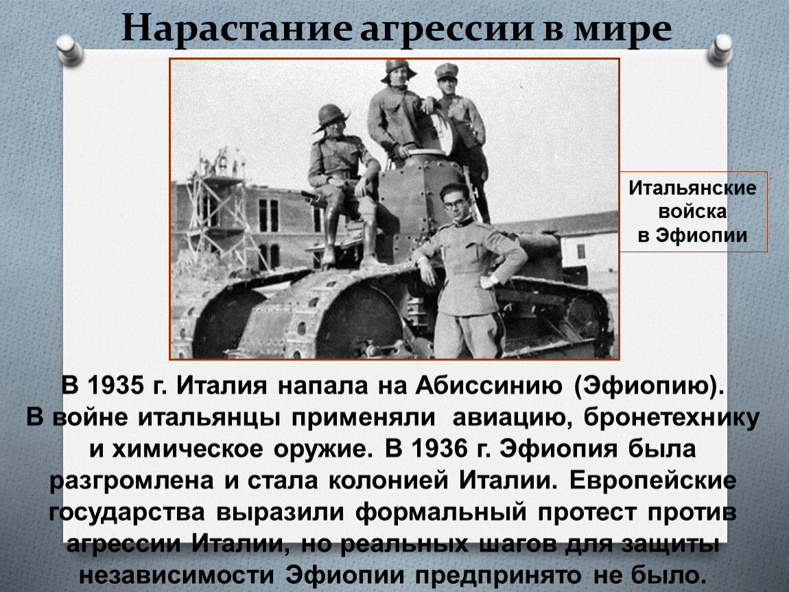 В 1935 г. Италия напала на Абиссинию (Эфиопию). В войне итальянцы применяли авиацию, бронетехнику и химическое оружие. В 1936 г. Эфиопия была разгромлена и стала колонией Италии. Европейские государства выразили формальный протест против агрессии Италии, но реальных шагов для защиты независимости Эфиопии предпринято не было.
