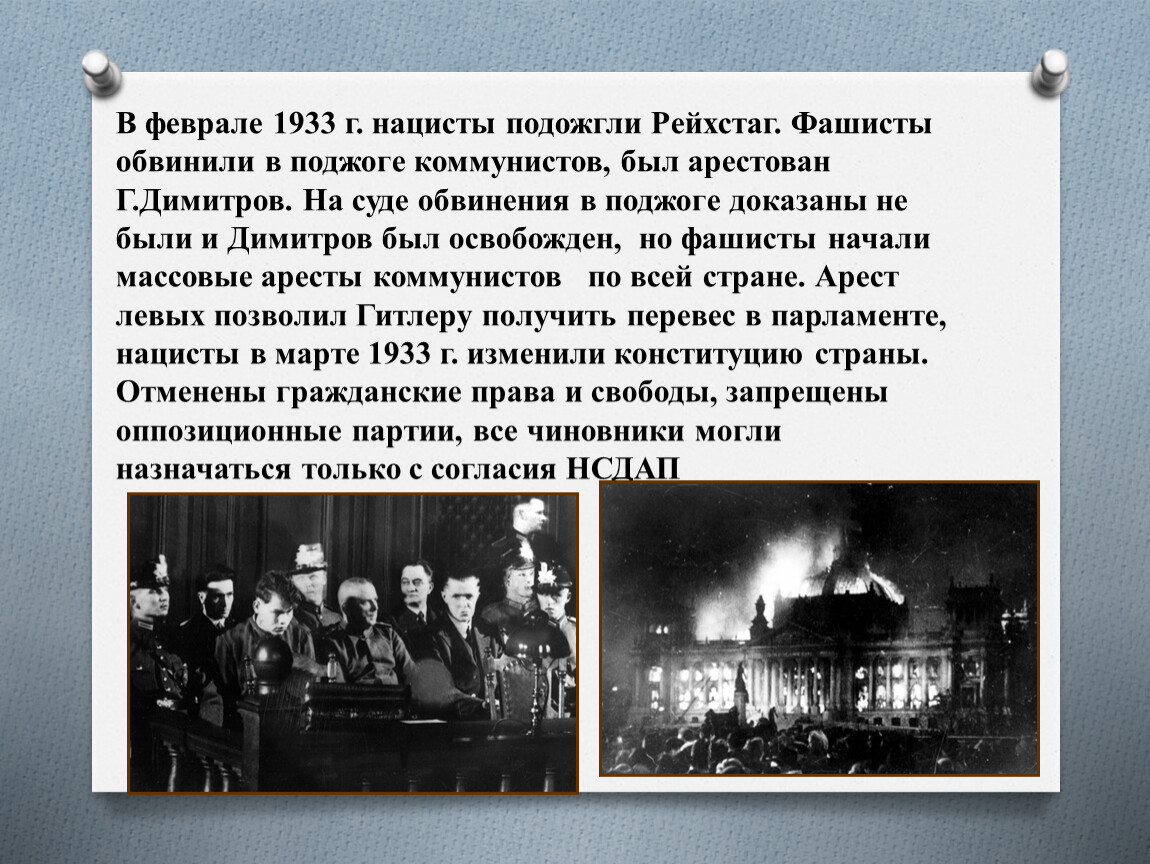 В феврале 1933 г. нацисты подожгли Рейхстаг. Фашисты обвинили в поджоге коммунистов, был арестован Г.Димитров. На суде обвинения в поджоге доказаны не были и Димитров был освобожден, но фашисты начали массовые аресты коммунистов по всей стране. Арест левых позволил Гитлеру получить перевес в парламенте, нацисты в марте 1933 г. изменили конституцию страны. Отменены гражданские права и свободы, запрещены оппозиционные партии, все чиновники могли назначаться только с согласия НСДАП