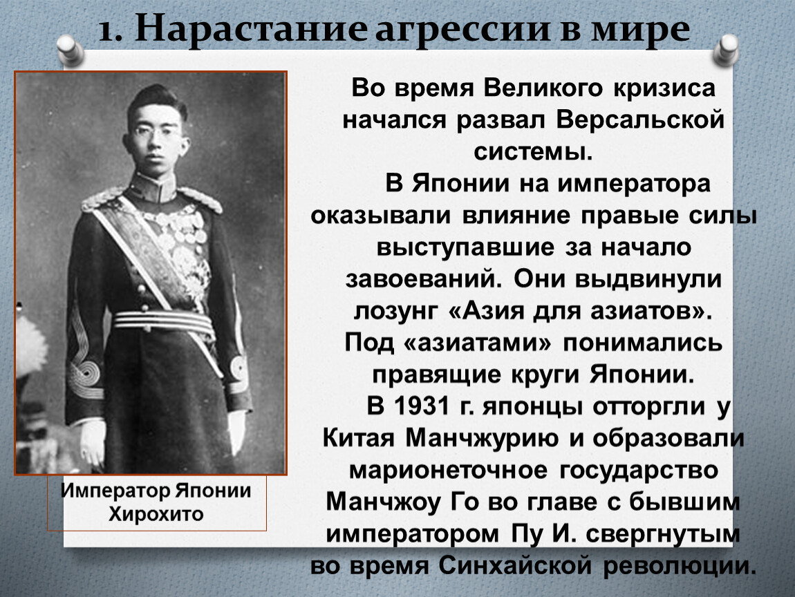 В 1931 г. японцы отторгли у Китая Манчжурию и образовали марионеточное государство Манчжоу Го во главе с бывшим императором Пу И. свергнутым во время Синхайской революции.
