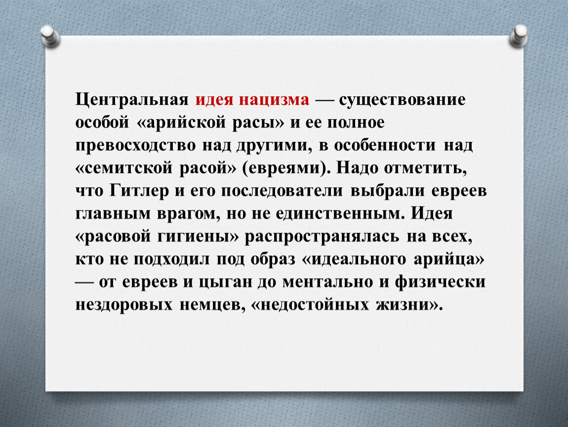 Центральная идея нацизма — существование особой «арийской расы» и ее полное превосходство над другими, в особенности над «семитской расой» (евреями). Надо отметить, что Гитлер и его последователи выбрали евреев главным врагом, но не единственным. Идея «расовой гигиены» распространялась на всех, кто не подходил под образ «идеального арийца» — от евреев и цыган до ментально и физически нездоровых немцев, «недостойных жизни».