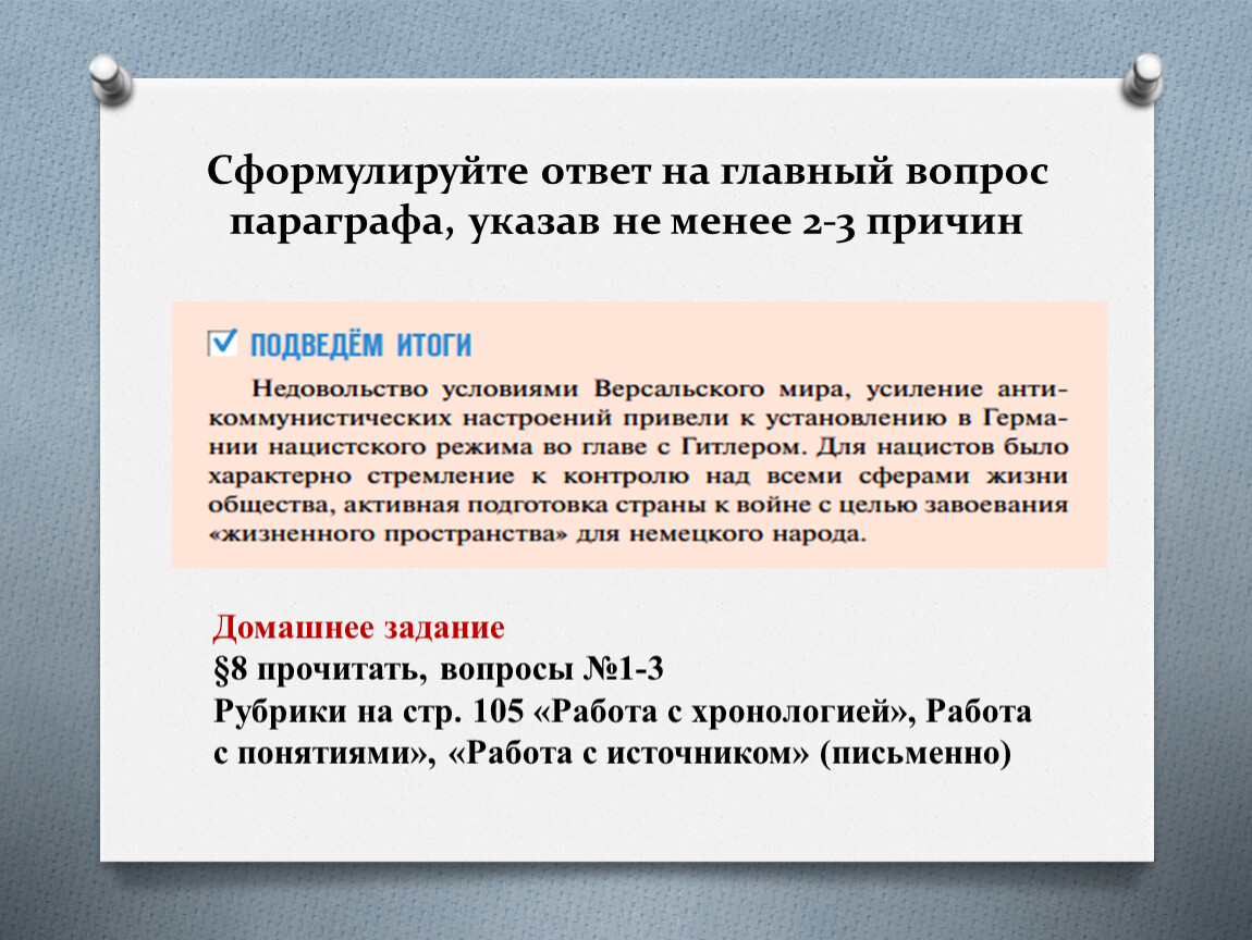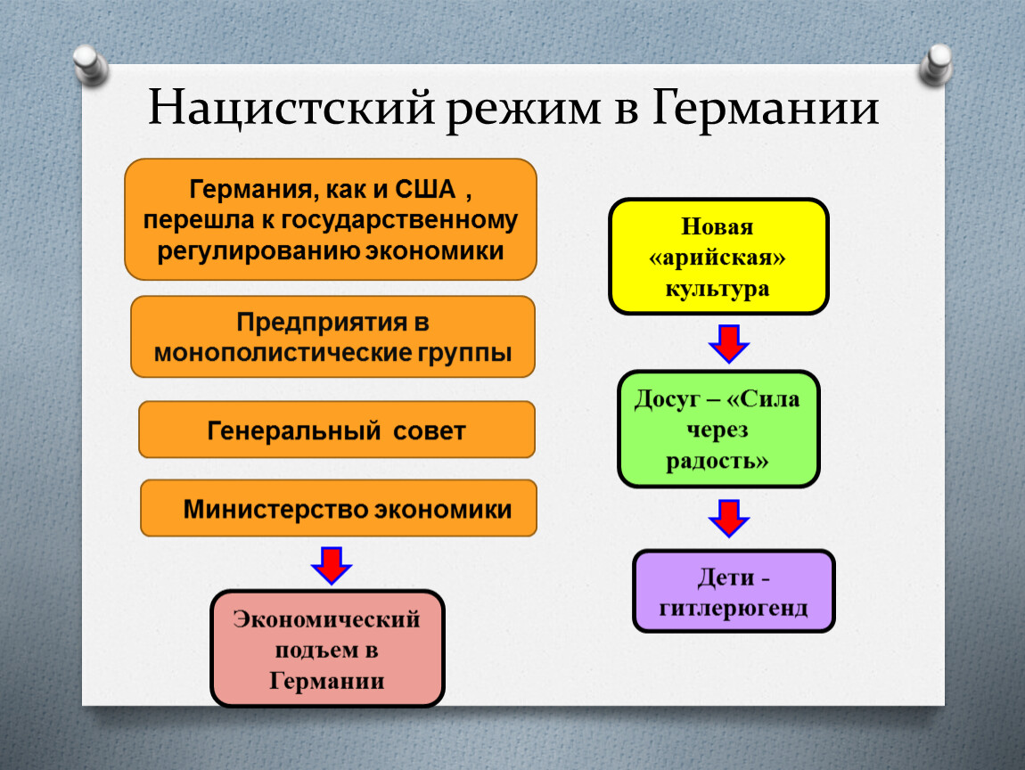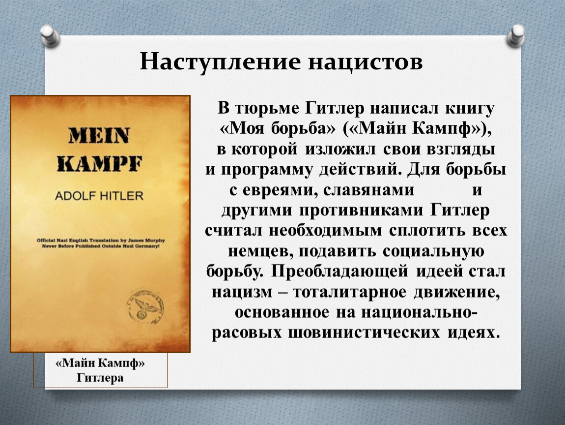 В тюрьме Гитлер написал книгу «Моя борьба» («Майн Кампф»), в которой изложил свои взгляды и программу действий. Для борьбы с евреями, славянами и другими противниками Гитлер считал необходимым сплотить всех немцев, подавить социальную борьбу. Преобладающей идеей стал нацизм – тоталитарное движение, основанное на национально-расовых шовинистических идеях.