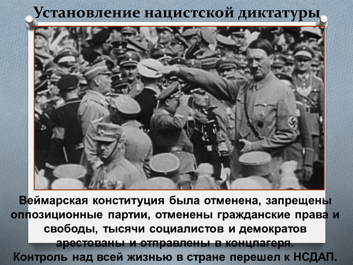 Веймарская конституция была отменена, запрещены оппозиционные партии, отменены гражданские права и свободы, тысячи социалистов и демократов арестованы и отправлены в концлагеря. Контроль над всей жизнью в стране перешел к НСДАП.