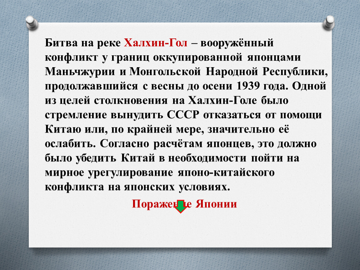 Битва на реке Халхин-Гол – вооружённый конфликт у границ оккупированной японцами Маньчжурии и Монгольской Народной Республики, продолжавшийся с весны до осени 1939 года. Одной из целей столкновения на Халхин-Голе было стремление вынудить СССР отказаться от помощи Китаю или, по крайней мере, значительно её ослабить. Согласно расчётам японцев, это должно было убедить Китай в необходимости пойти на мирное урегулирование японо-китайского конфликта на японских условиях.