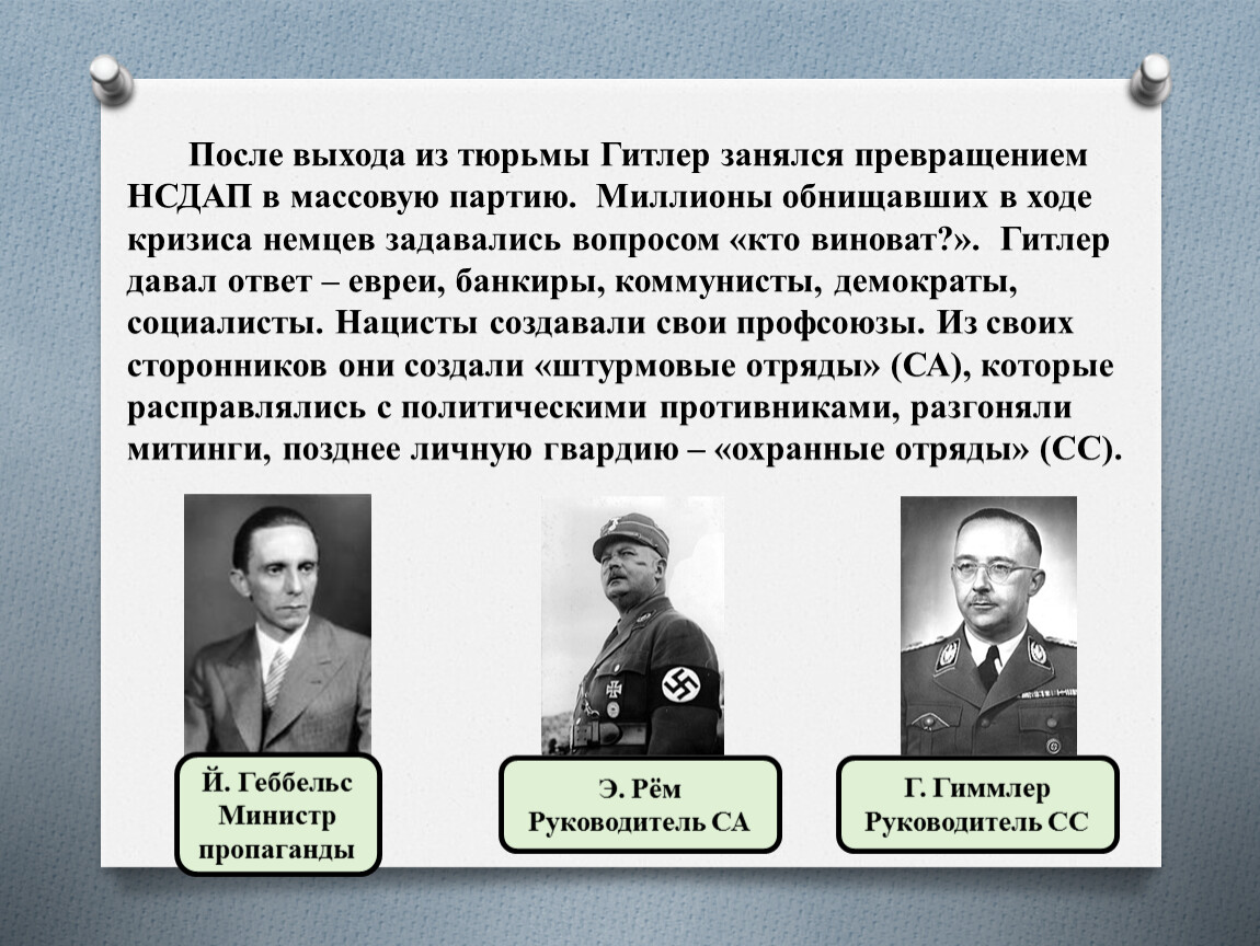 После выхода из тюрьмы Гитлер занялся превращением НСДАП в массовую партию. Миллионы обнищавших в ходе кризиса немцев задавались вопросом «кто виноват?». Гитлер давал ответ – евреи, банкиры, коммунисты, демократы, социалисты. Нацисты создавали свои профсоюзы. Из своих сторонников они создали «штурмовые отряды» (СА), которые расправлялись с политическими противниками, разгоняли митинги, позднее личную гвардию – «охранные отряды» (СС).