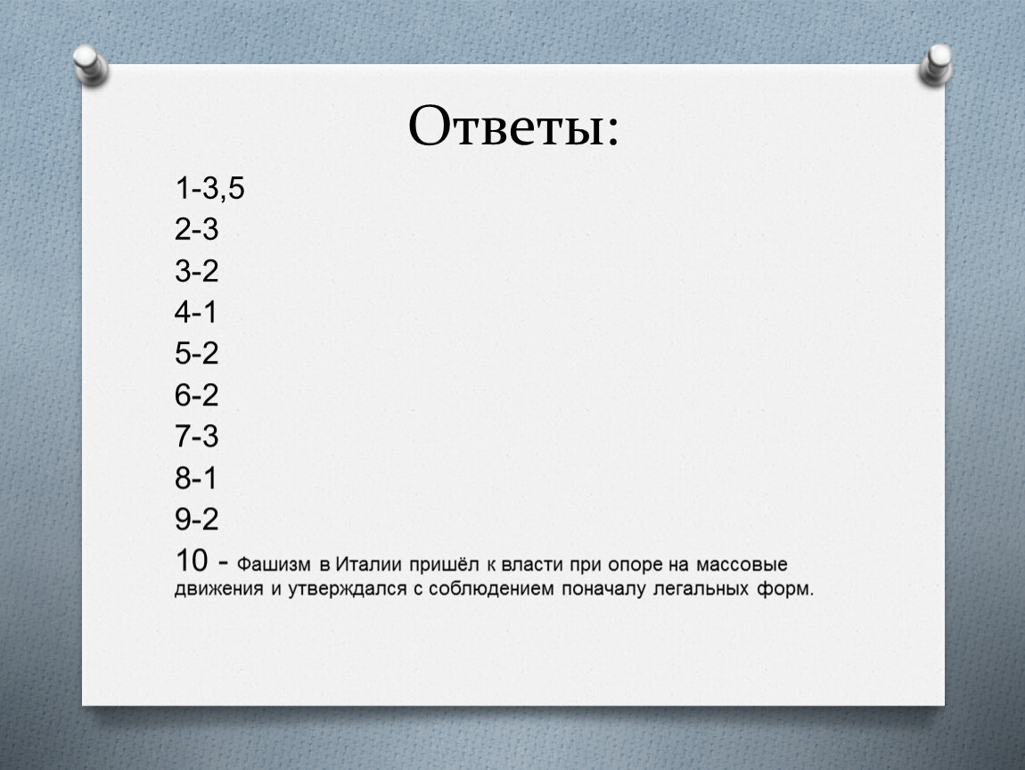 10 - Фашизм в Италии пришёл к власти при опоре на массовые движения и утверждался с соблюдением поначалу легальных форм.