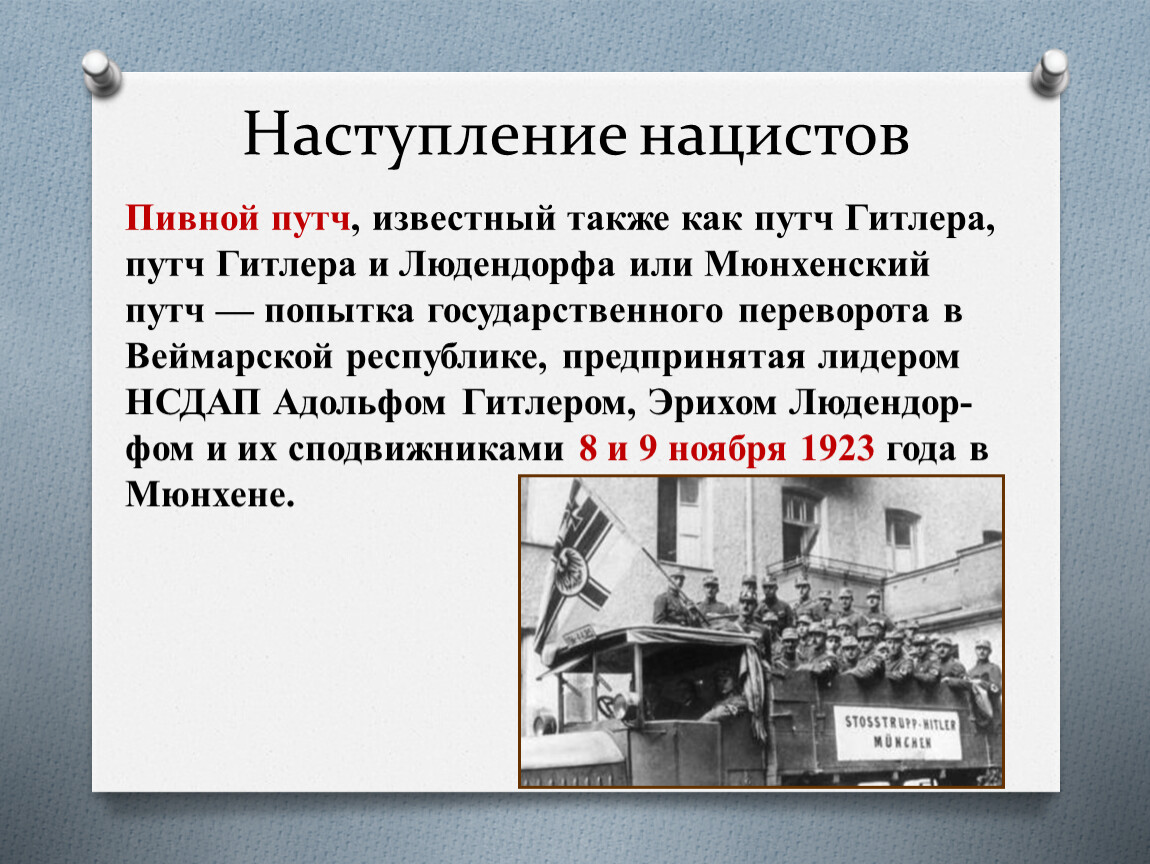 Пивной путч, известный также как путч Гитлера, путч Гитлера и Людендорфа или Мюнхенский путч — попытка государственного переворота в Веймарской республике, предпринятая лидером НСДАП Адольфом Гитлером, Эрихом Людендор-фом и их сподвижниками 8 и 9 ноября 1923 года в Мюнхене.