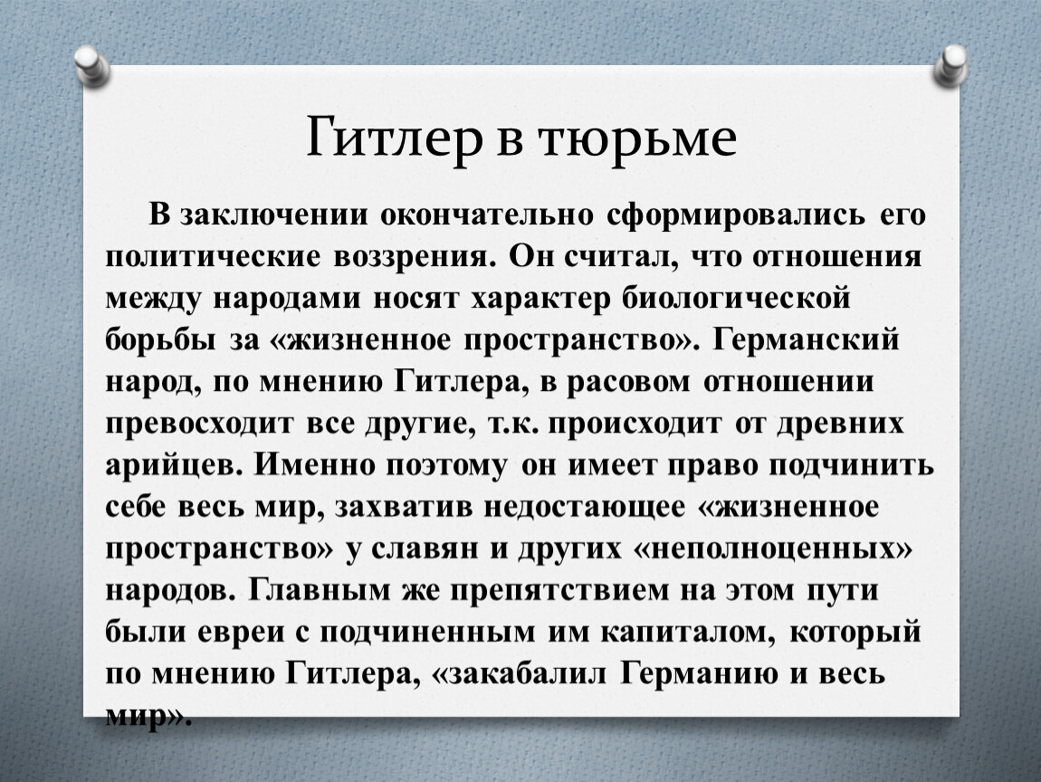 В заключении окончательно сформировались его политические воззрения. Он считал, что отношения между народами носят характер биологической борьбы за «жизненное пространство». Германский народ, по мнению Гитлера, в расовом отношении превосходит все другие, т.к. происходит от древних арийцев. Именно поэтому он имеет право подчинить себе весь мир, захватив недостающее «жизненное пространство» у славян и других «неполноценных» народов. Главным же препятствием на этом пути были евреи с подчиненным им капиталом, который по мнению Гитлера, «закабалил Германию и весь мир».
