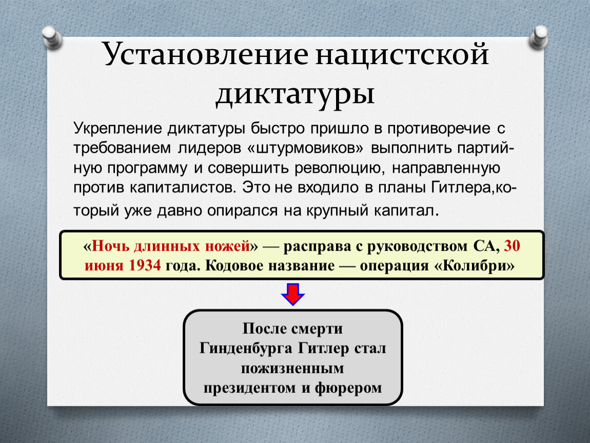 Укрепление диктатуры быстро пришло в противоречие с требованием лидеров «штурмовиков» выполнить партий-ную программу и совершить революцию, направленную против капиталистов. Это не входило в планы Гитлера,ко-торый уже давно опирался на крупный капитал.