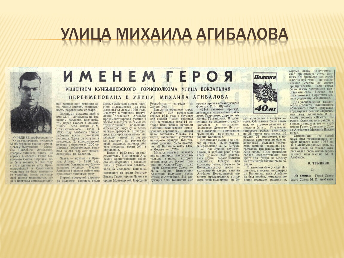 Михаил Сорокин - наш земляк. Окончил Куйбышевский строительный техникум. Работал прорабом, заочно учился в Куйбышевском строительном институте. В Красной Армии — в 1932-1934 годах, в 1939 году (участвовал в боях с японцами на реке Халхин-Гол). В 1941 году окончил Киевское артиллерийское училище. На фронте с апреля 1942 года. Командир артиллерийского дивизиона 118-го артиллерийского полка. За доблесть и мужество, проявленные в боях на Курской дуге, он был награжден орденами Отечественной войны 2-й степени и Александра Невского. Затем были тяжелые бои на подходе к Белоруссии. Противотанковому артиллерийскому дивизиону майора Сорокина, с передовым отрядом 65-й армии, предстояло подготовить форсирование Днепра, превращенного немцами в неприступную преграду. Советский десант высадился на правом берегу реки. В маленьком окопе, под вражеским огнем Сорокин с разведчиками Максимовым и Пайкиным установили стереотрубу, засекли 14 вражеских станковых и ручных пулеметов, 4 блиндажа, минометную батарею и 6 противотанковых пушек. В ходе боя все это было уничтожено орудиями майора Сорокина. Но немцы предпринимают контратаки. Михаил Сорокин погиб 12 декабря 1943 года, в ожесточенном бою среди белорусского Полесья, у райцентра Василевичи, Жлобинскогорайона Гомельской области. Улица Михаила Сорокина находится в Советском районе.
