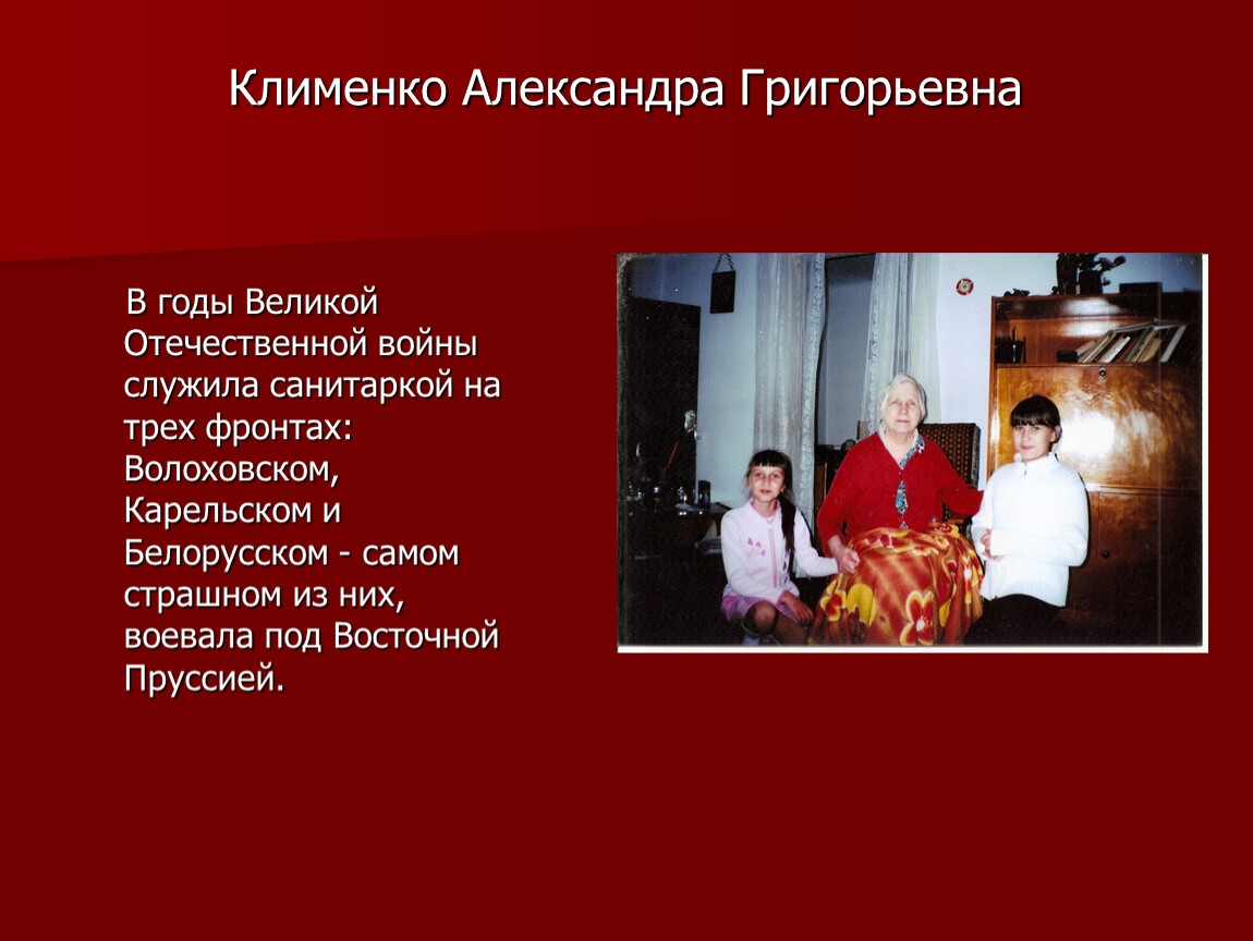 В годы Великой Отечественной войны служила санитаркой на трех фронтах: Волоховском, Карельском и Белорусском - самом страшном из них, воевала под Восточной Пруссией.