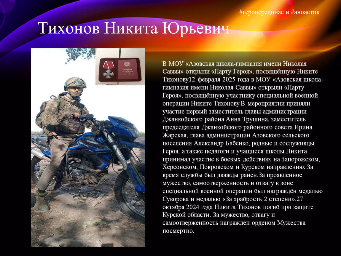 В МОУ «Азовская школа-гимназия имени Николая Саввы» открыли «Парту Героя», посвящённую Никите Тихонову12 февраля 2025 года в МОУ «Азовская школа-гимназия имени Николая Саввы» открыли «Парту Героя», посвящённую участнику специальной военной операции Никите Тихонову.В мероприятии приняли участие первый заместитель главы администрации Джанкойского района Анна Трушина, заместитель председателя Джанкойского районного совета Ирина Жарская, глава администрации Азовского сельского поселения Александр Бабенко, родные и сослуживцы Героя, а также педагоги и учащиеся школы.Никита принимал участие в боевых действиях на Запорожском, Херсонском, Покровском и Курском направлениях.За время службы был дважды ранен.За проявленное мужество, самоотверженность и отвагу в зоне специальной военной операции был награждён медалью Суворова и медалью «За храбрость 2 степени».27 октября 2024 года Никита Тихонов погиб при защите Курской области. За мужество, отвагу и самоотверженность награжден орденом Мужества посмертно.