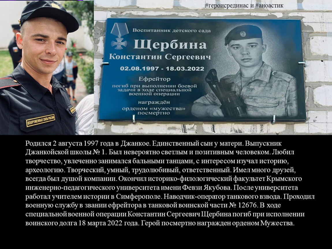 Родился 2 августа 1997 года в Джанкое. Единственный сын у матери. Выпускник Джанкойской школы № 1. Был невероятно светлым и позитивным человеком. Любил творчество, увлеченно занимался бальными танцами, с интересом изучал историю, археологию. Творческий, умный, трудолюбивый, ответственный. Имел много друзей, всегда был душой компании. Окончил историко-филологический факультет Крымского инженерно-педагогического университета имени Февзи Якубова. После университета работал учителем истории в Симферополе. Наводчик-оператор танкового взвода. Проходил военную службу в звании ефрейтора в танковой воинской части № 12676. В ходе специальной военной операции Константин Сергеевич Щербина погиб при исполнении воинского долга 18 марта 2022 года. Герой посмертно награжден орденом Мужества.