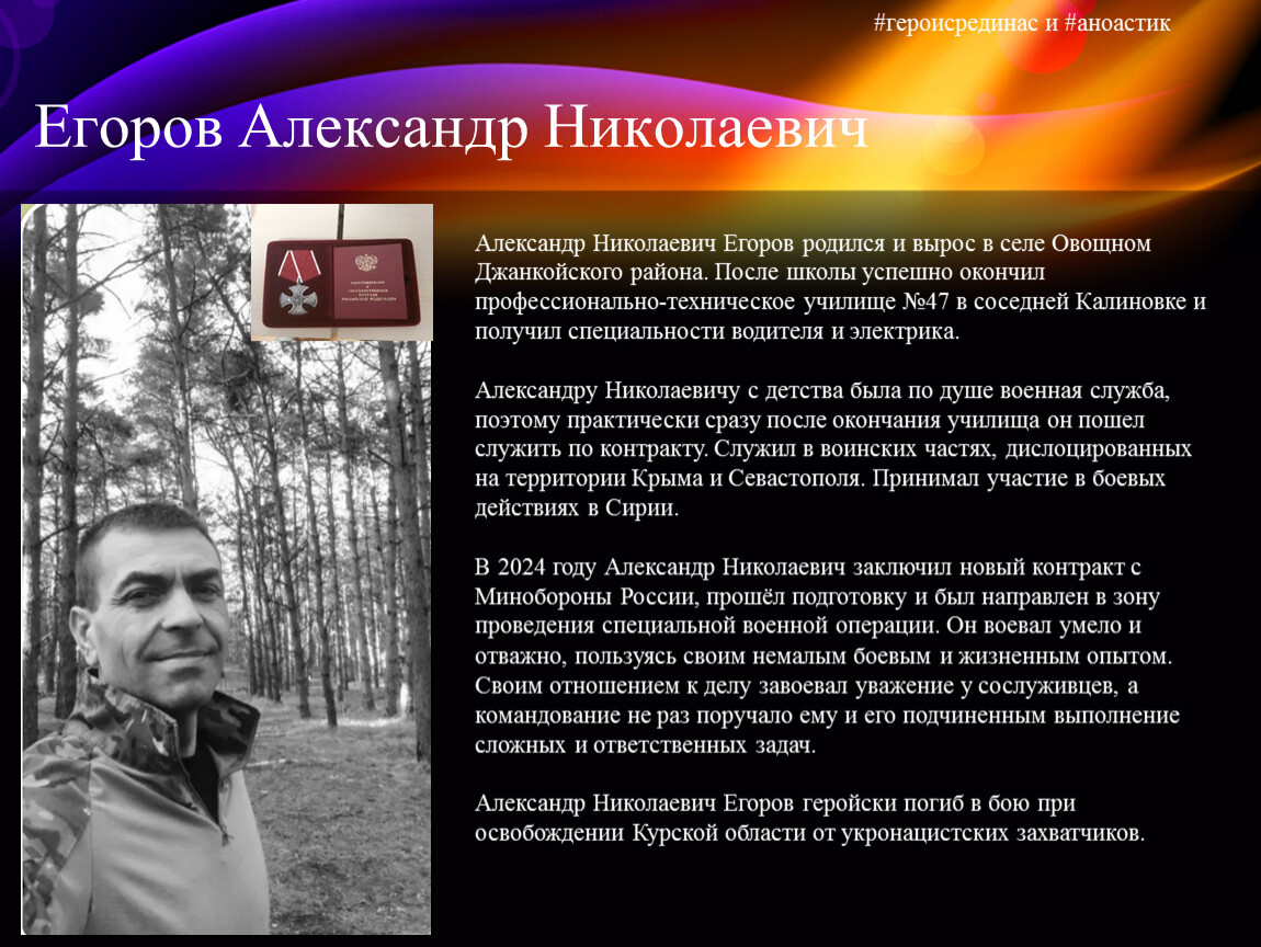 Александр Николаевич Егоров геройски погиб в бою при освобождении Курской области от укронацистских захватчиков.