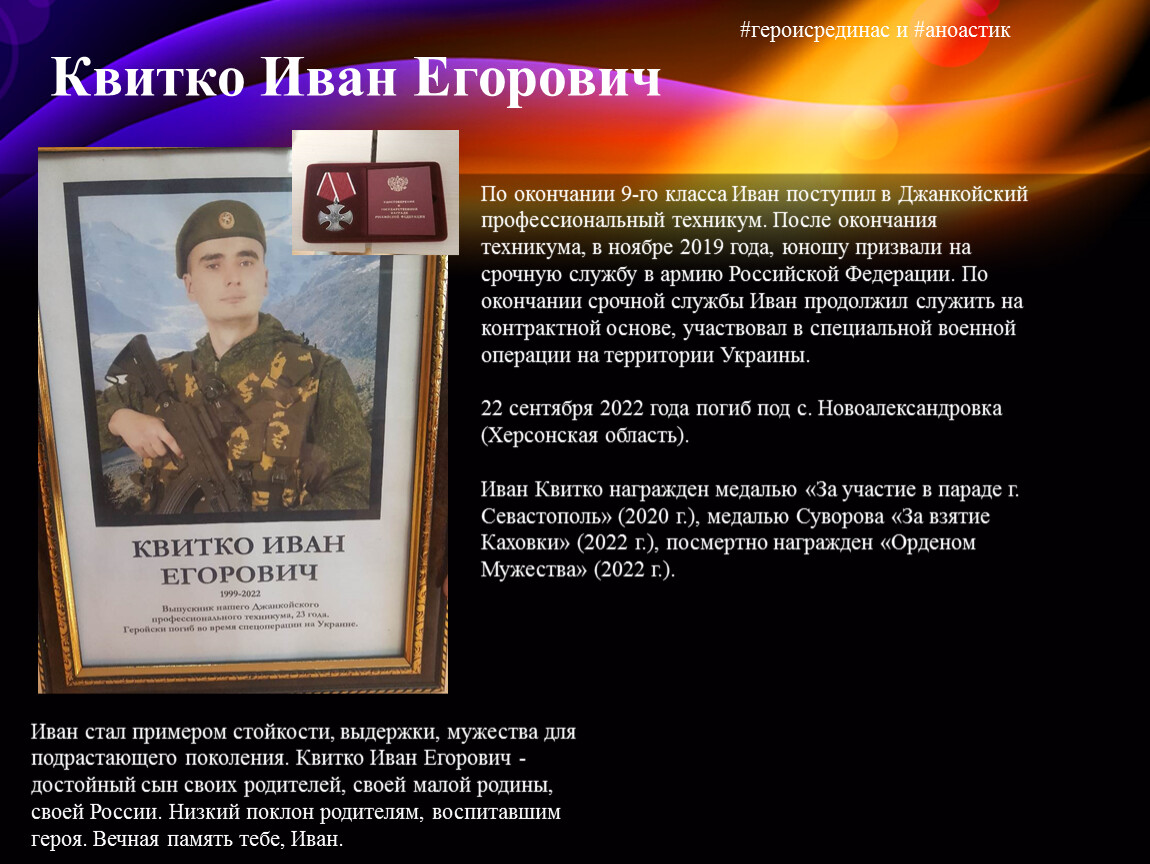 Иван стал примером стойкости, выдержки, мужества для подрастающего поколения. Квитко Иван Егорович - достойный сын своих родителей, своей малой родины, своей России. Низкий поклон родителям, воспитавшим героя. Вечная память тебе, Иван.