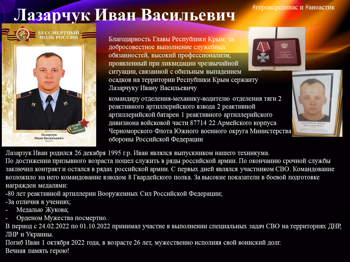 Лазарзук Иван родился 26 декабря 1995 г.р. Иван являлся выпускником нашего техникума.По достижении призывного возраста пошел служить в ряды российской армии. По окончанию срочной службы заключил контракт и остался в рядах российской армии. С первых дней являлся участником СВО. Командование возложило на него командование взводом 8 Гвардейского полка. За высокие показатели в боевой подготовке награжден медалями: