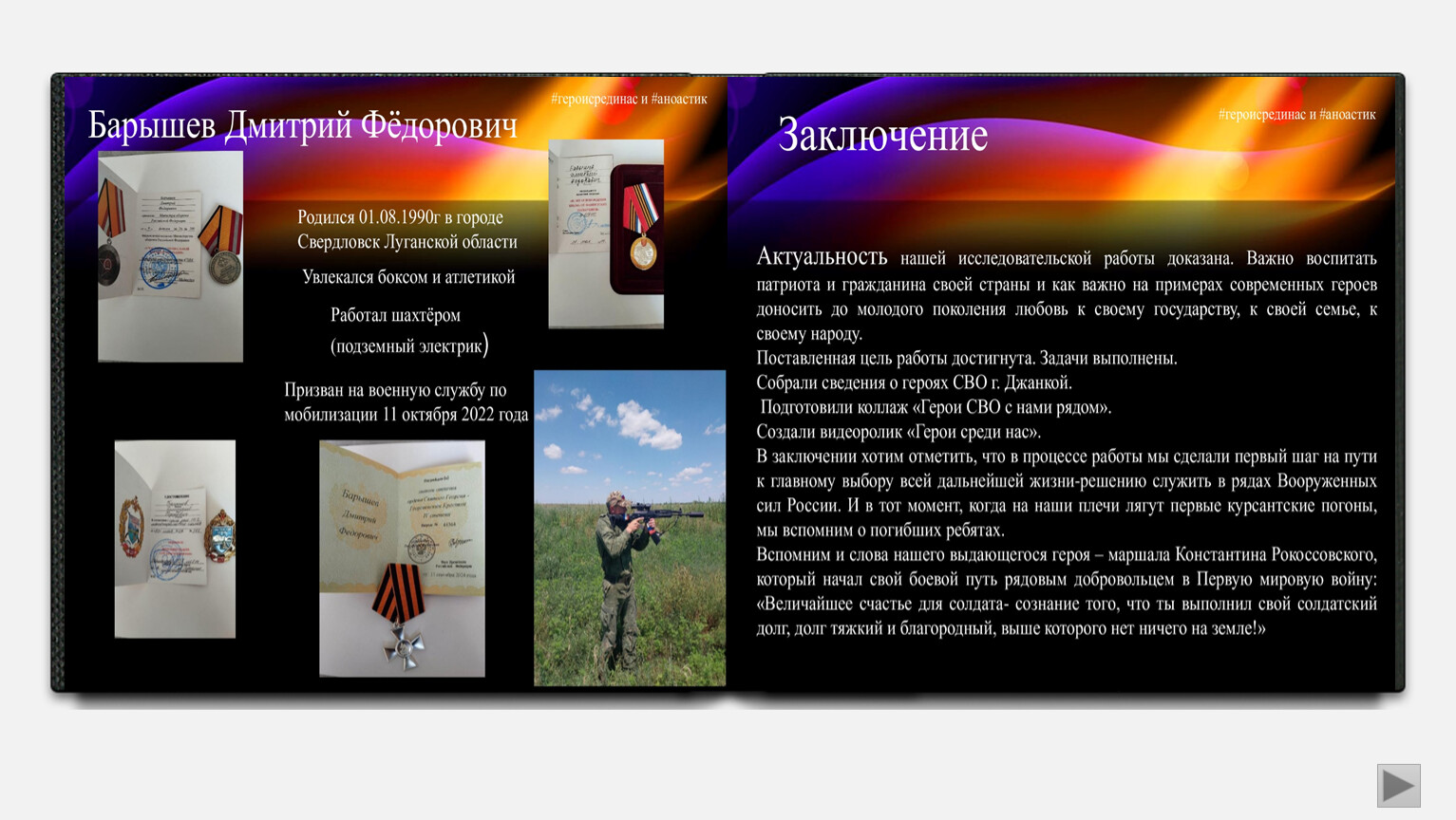 В заключении хотим отметить, что в процессе работы мы сделали первый шаг на пути к главному выбору всей дальнейшей жизни-решению служить в рядах Вооруженных сил России. И в тот момент, когда на наши плечи лягут первые курсантские погоны, мы вспомним о погибших ребятах.