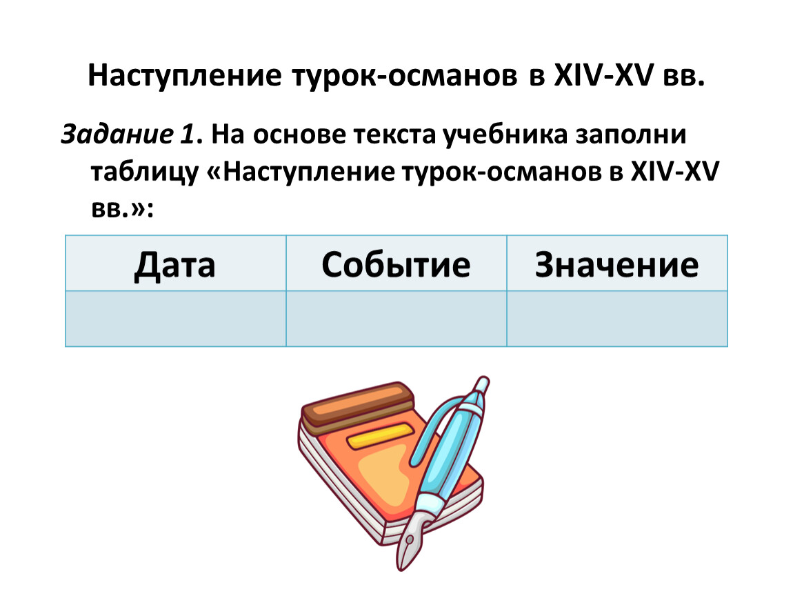 Задание 1. На основе текста учебника заполни таблицу «Наступление турок-османов в XIV-XV вв.»: