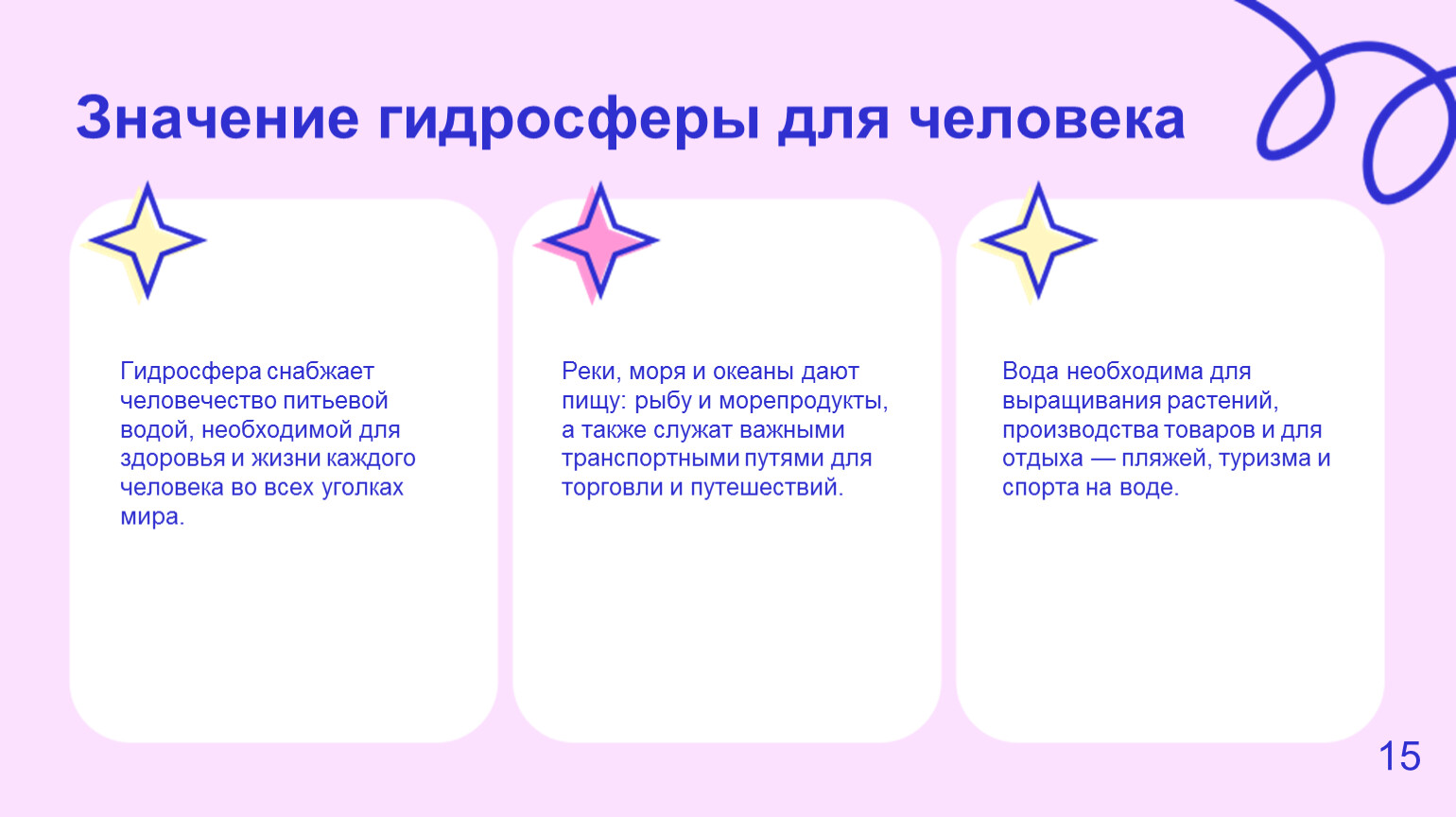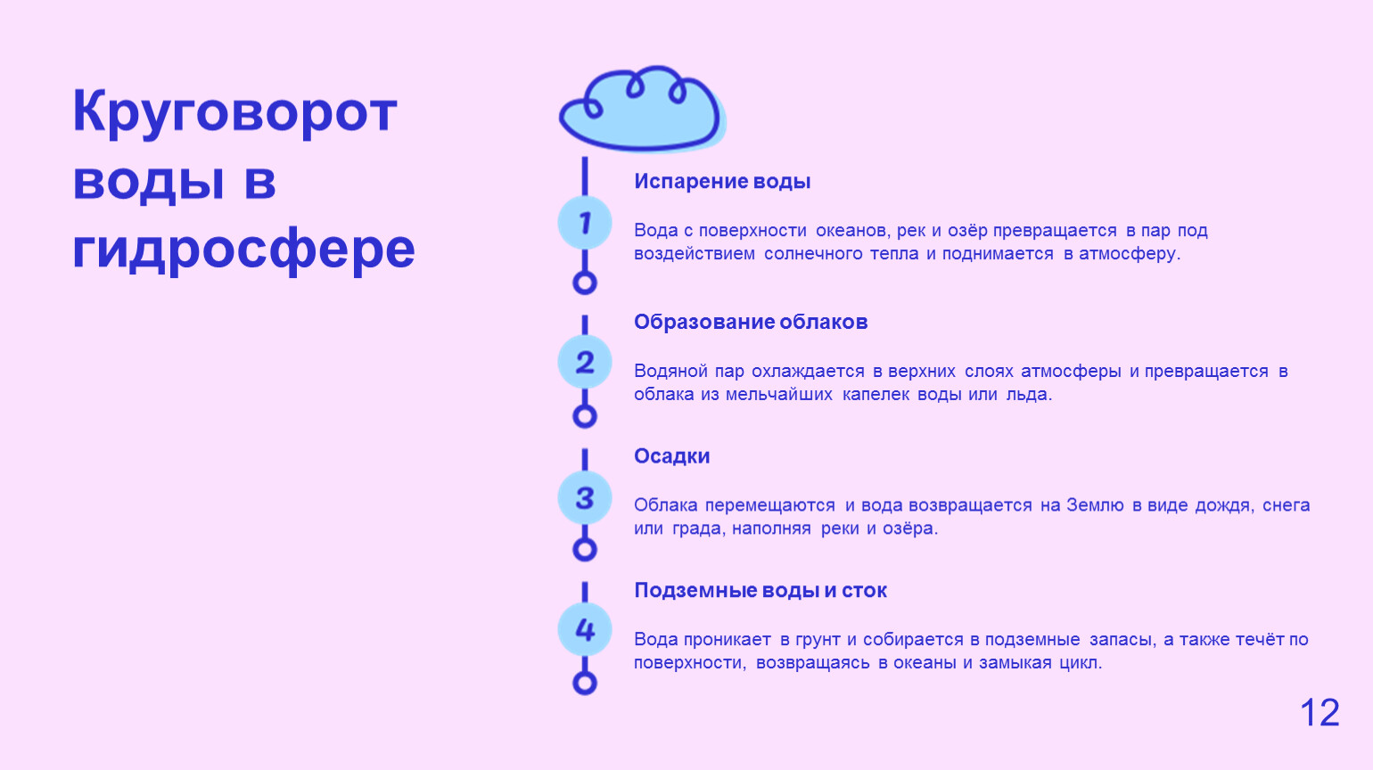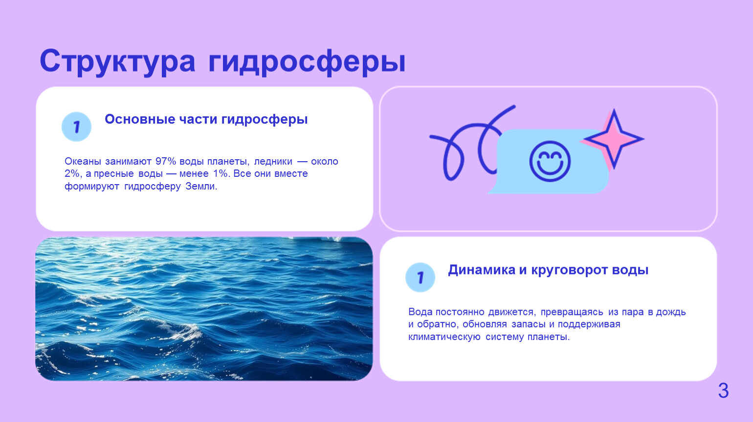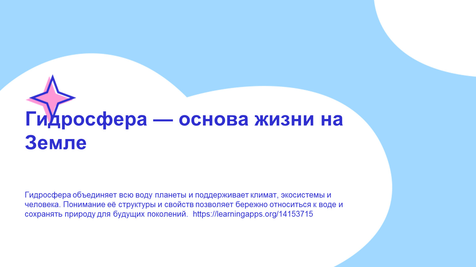 Гидросфера объединяет всю воду планеты и поддерживает климат, экосистемы и человека. Понимание её структуры и свойств позволяет бережно относиться к воде и сохранять природу для будущих поколений. https://learningapps.org/14153715