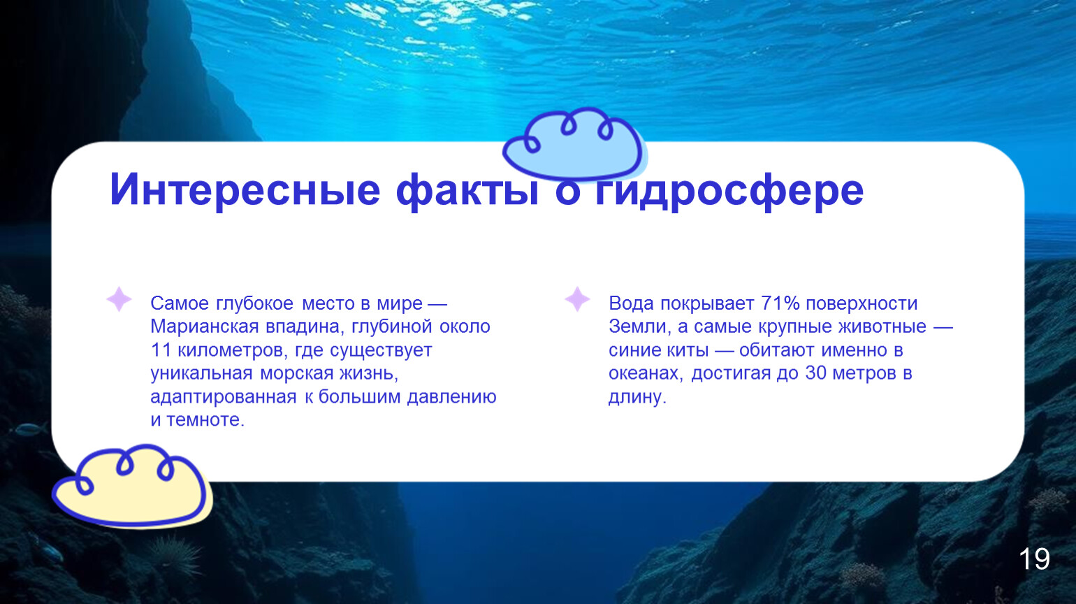 Вода покрывает 71% поверхности Земли, а самые крупные животные — синие киты — обитают именно в океанах, достигая до 30 метров в длину.