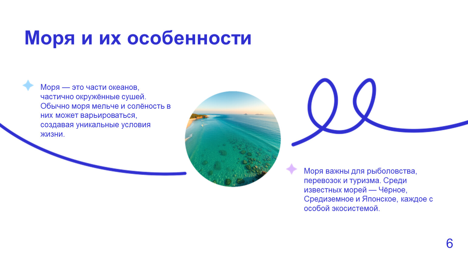 Моря — это части океанов, частично окружённые сушей. Обычно моря мельче и солёность в них может варьироваться, создавая уникальные условия жизни.