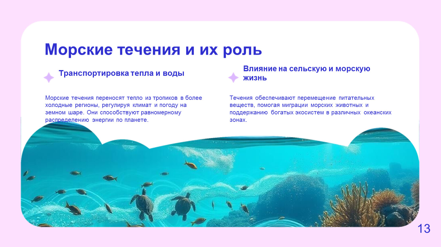 Течения обеспечивают перемещение питательных веществ, помогая миграции морских животных и поддержанию богатых экосистем в различных океанских зонах.